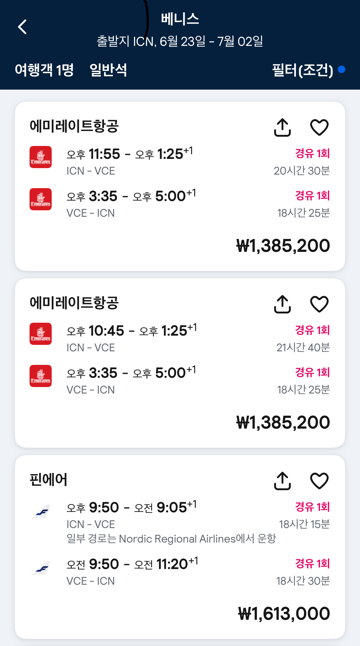 그 외에도 중동의 Big 3 항공사에서 운항하는 애미레이트항공, 카타르항공, 에티하드항공은 운행시간과 가격이 비숫하다. 최근 들어 공격적인 마케팅을 하는 핀에어도 검색 대상에 포함시켜 그중에서 가장 저렴한 항공편을 선택한다. 결국 경유 편을 이용한다면 선택할 수 있는 옵션도 다양하고 다소 늦게 여행을 결정해도 비용 측면에서 부담이 덜하다.