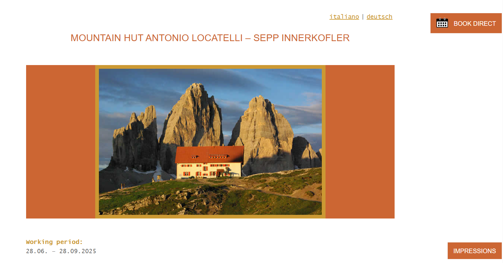 트레치메의 로카텔리산장 : https://www.dreizinnenhuette.com/antonio-locatelli-hut.php 로카텔리산장은 여름시즌만 문을 연다. 예약은 2월 중순부터 받기 시작하므로 이 시기에 맞춰 예약하면 된다.