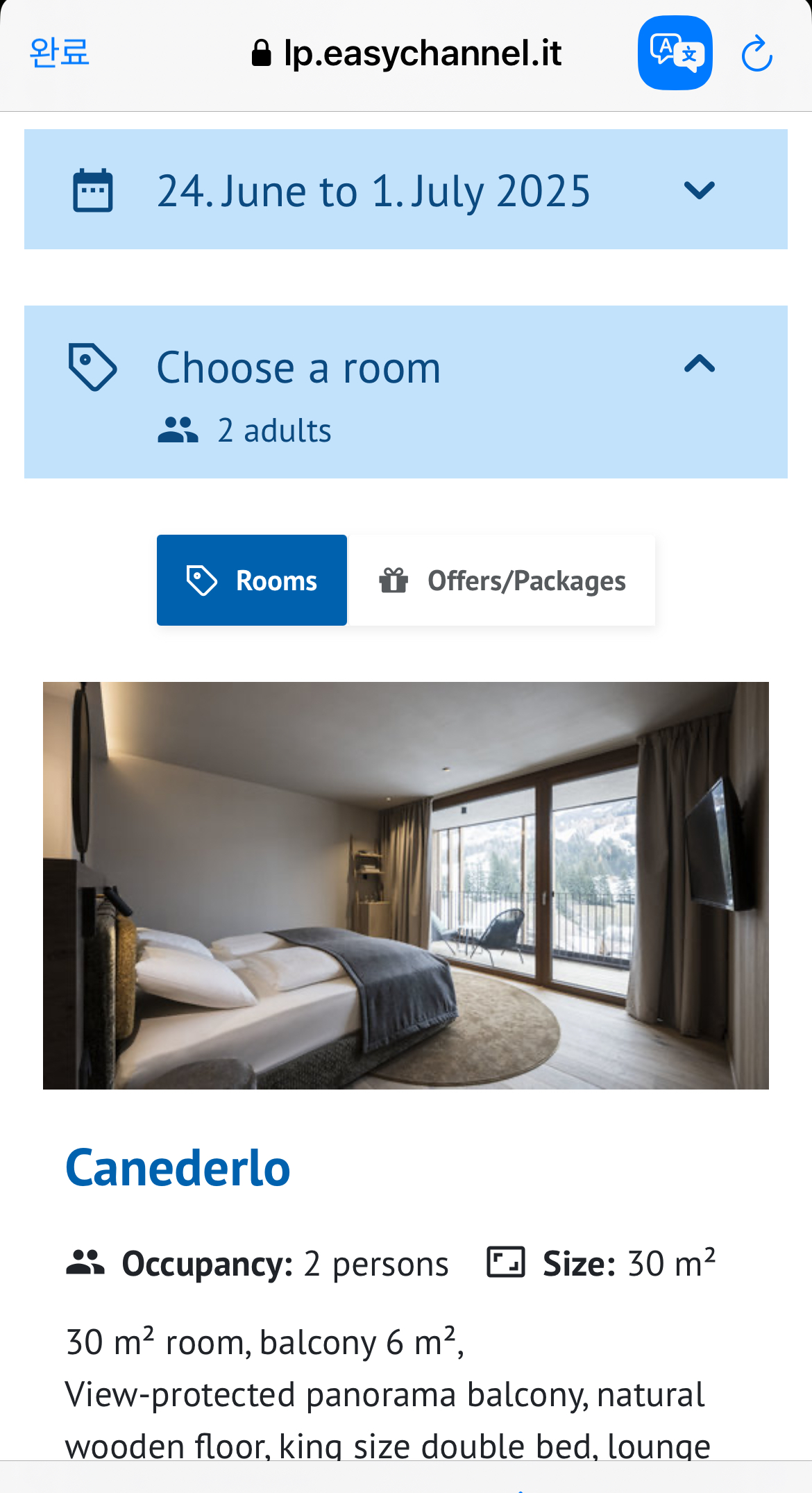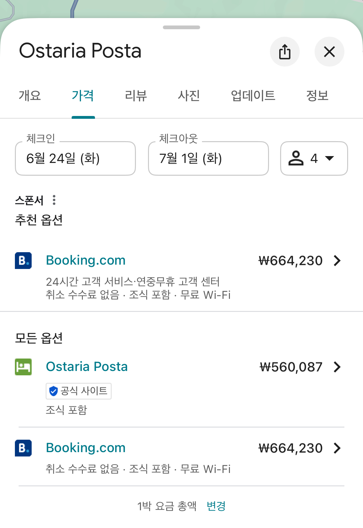 지도에 호텔이 있는 위치와 함께 하루 숙박비가 표시된다. 맘에 드는 숙소를 선택하고 ‘예약 가능여부’ 탭을 클릭하면 추천 옵션이 표시된다. 사진에서처럼 해당 숙소 홈페이지에서 예약하는 게 대행사인 Booking.com에서 하는 거보다 싸다.