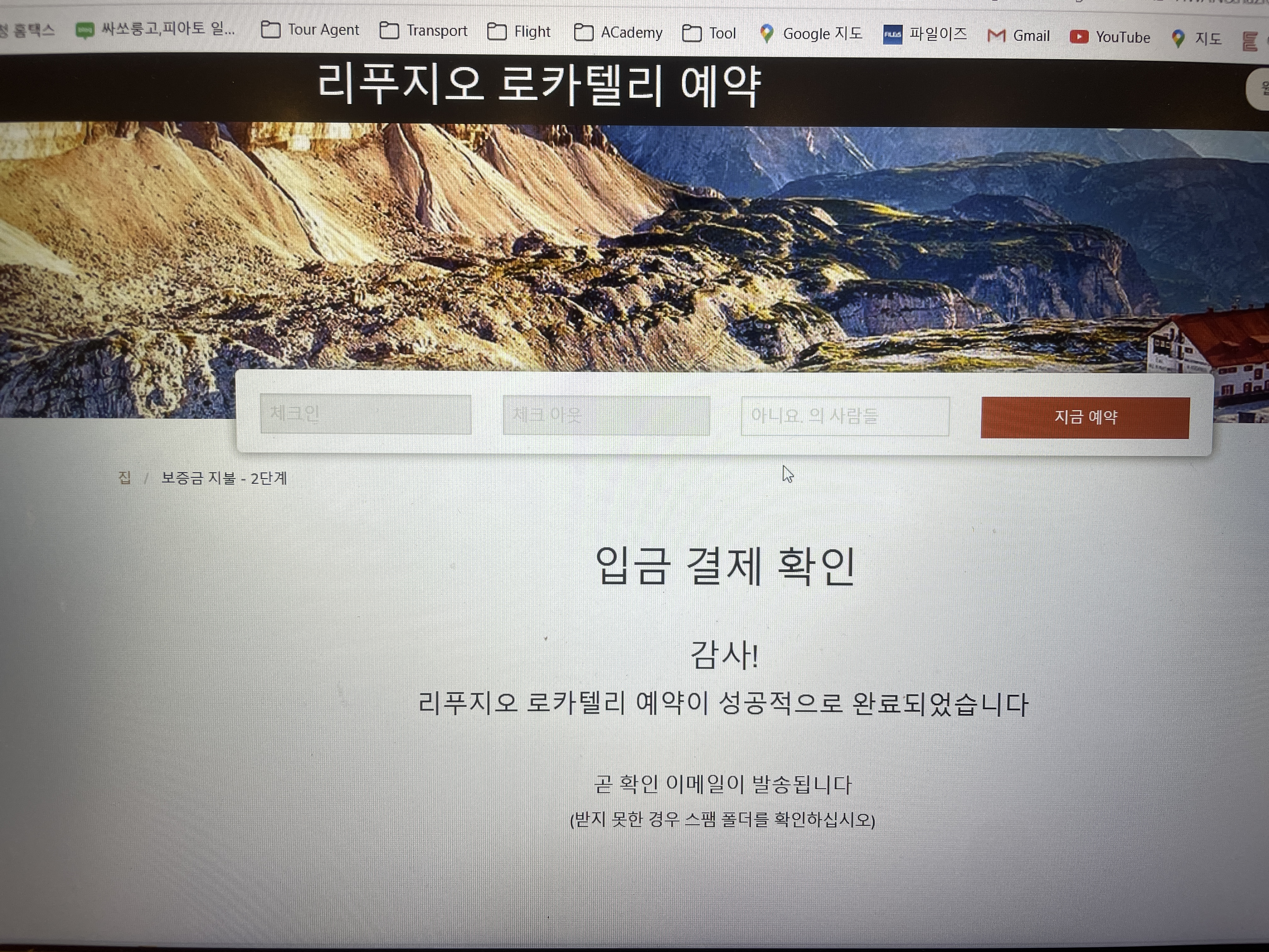 산장 예약신청이 등록되면 산장에서 예약금을 입금하라는 메일을 받게 되고 메일에 결제 URL을 함께 보내준다. 결제 연결창에서 요청받은 예약금을 결제하면 화면과 같이 예약 컨펌 메일을 받음으로써 예약이 마무리된다. 날짜가 되어 산장에 도착해 잔금을 결제하게 되는데 대부분 산장이 인터넷 연결이 원활치 못해 현금으로 결제해야 함에 유의할 필요가 있다.