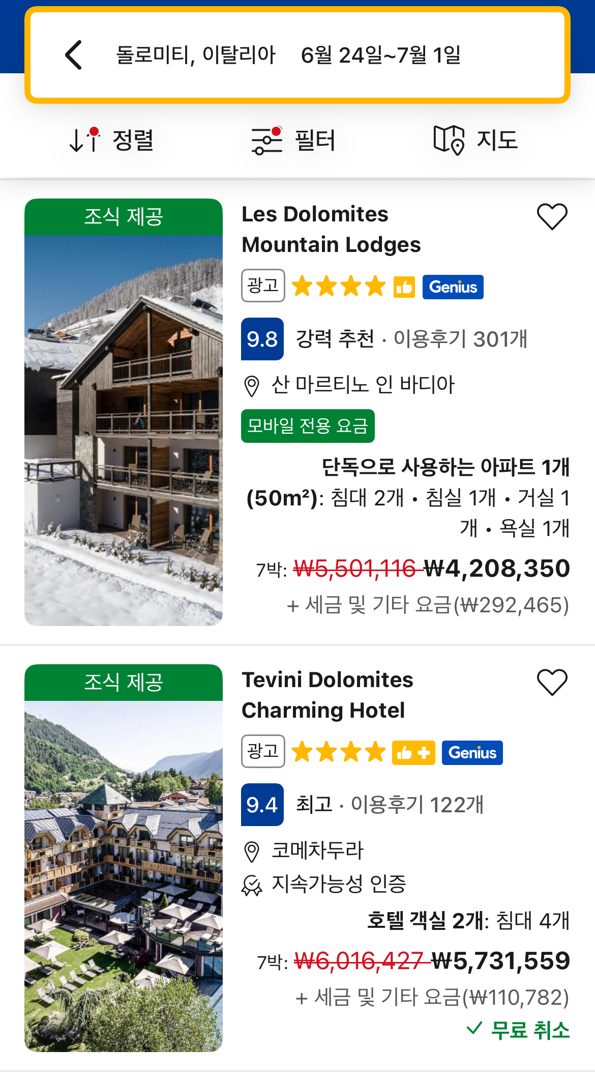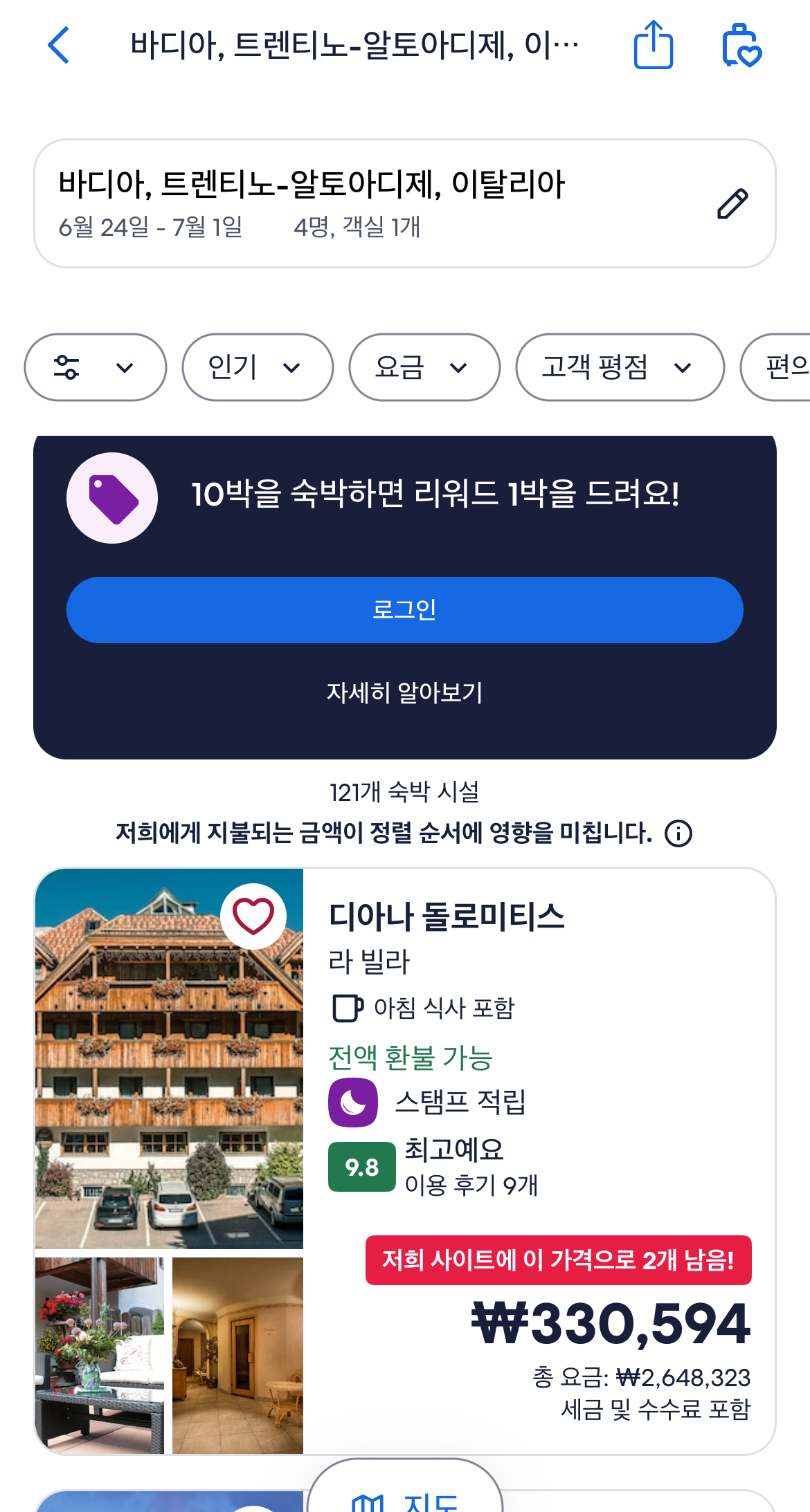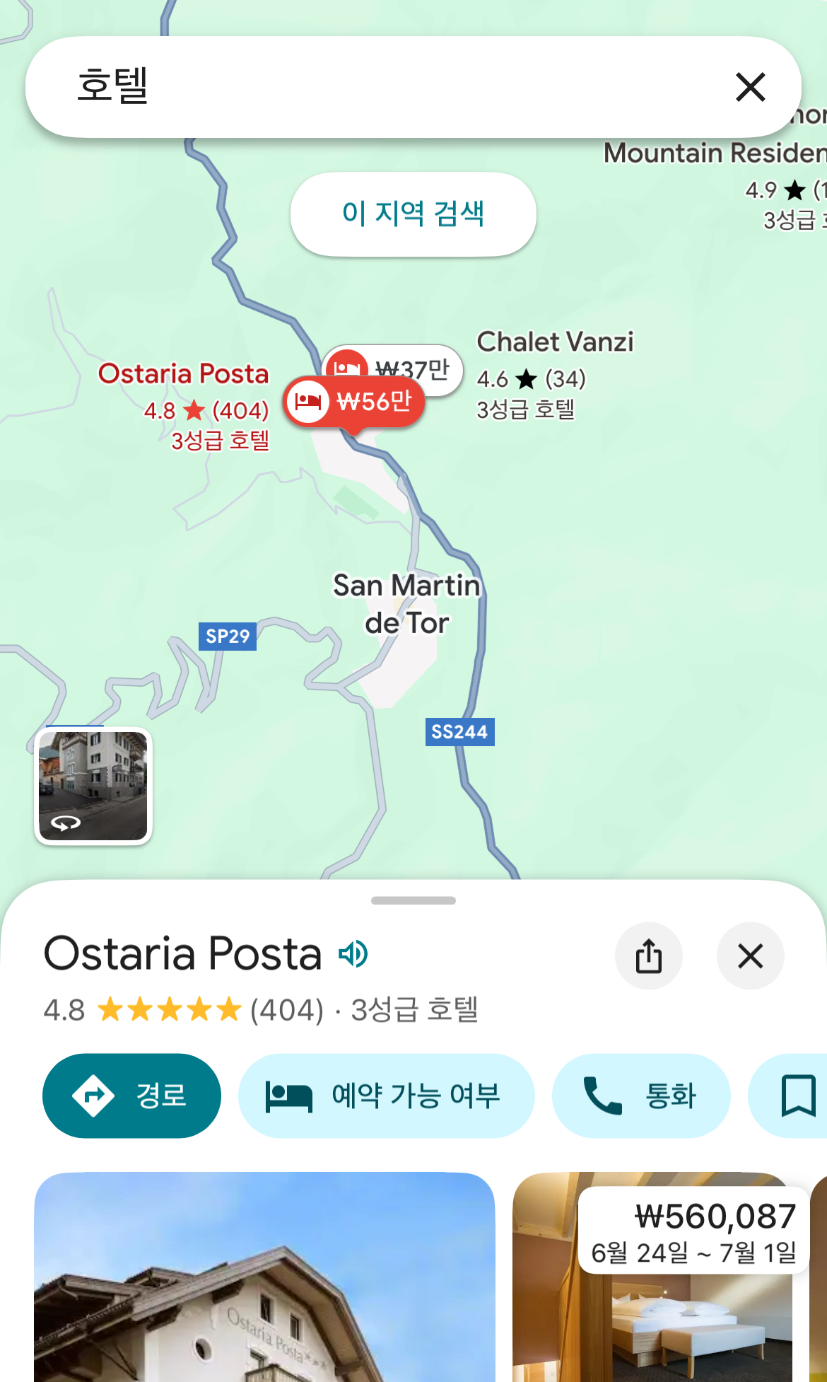 지금까지 돌로미티에서 숙소를 어디로 정하고, 어떤 형태의 숙소가 있는지 그리고 산장에서 일박을 하는 방법을 알아보았다. 지금부터는 가성비 좋은 숙소를 확보하는 방법에 대해서 알아본다. 먼저 구글맵에서 숙소를 잡을 위치를 검색한 다음 검색창 아래 있는 ’ 호텔‘ 을 선택한다. 묵을 기간과 방 개수 그리고 숙소형태, 평점, 부대조건, 희망가격 같은 조건을 선택하면 조건에 맞는 숙소들아 나열된다.