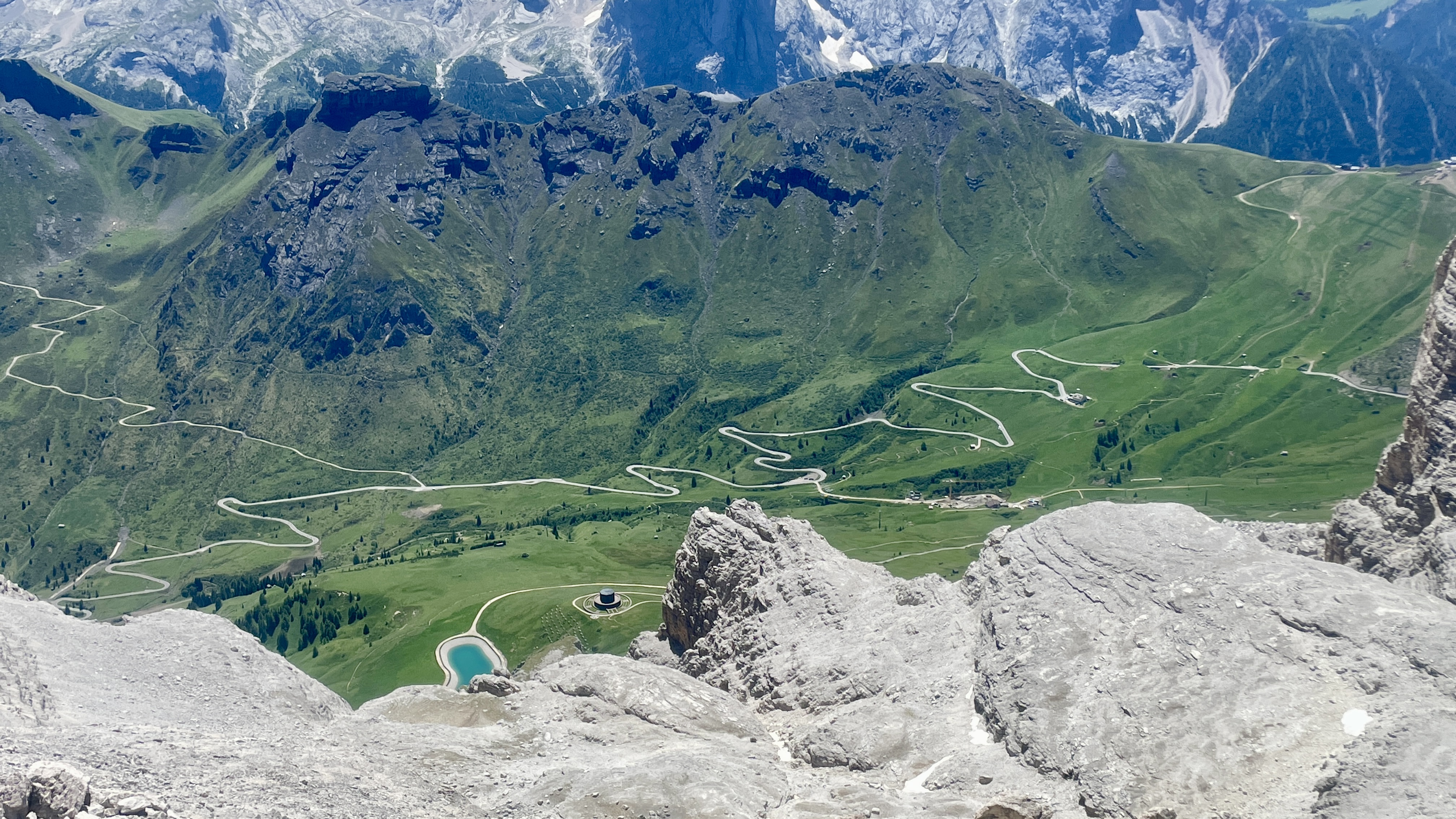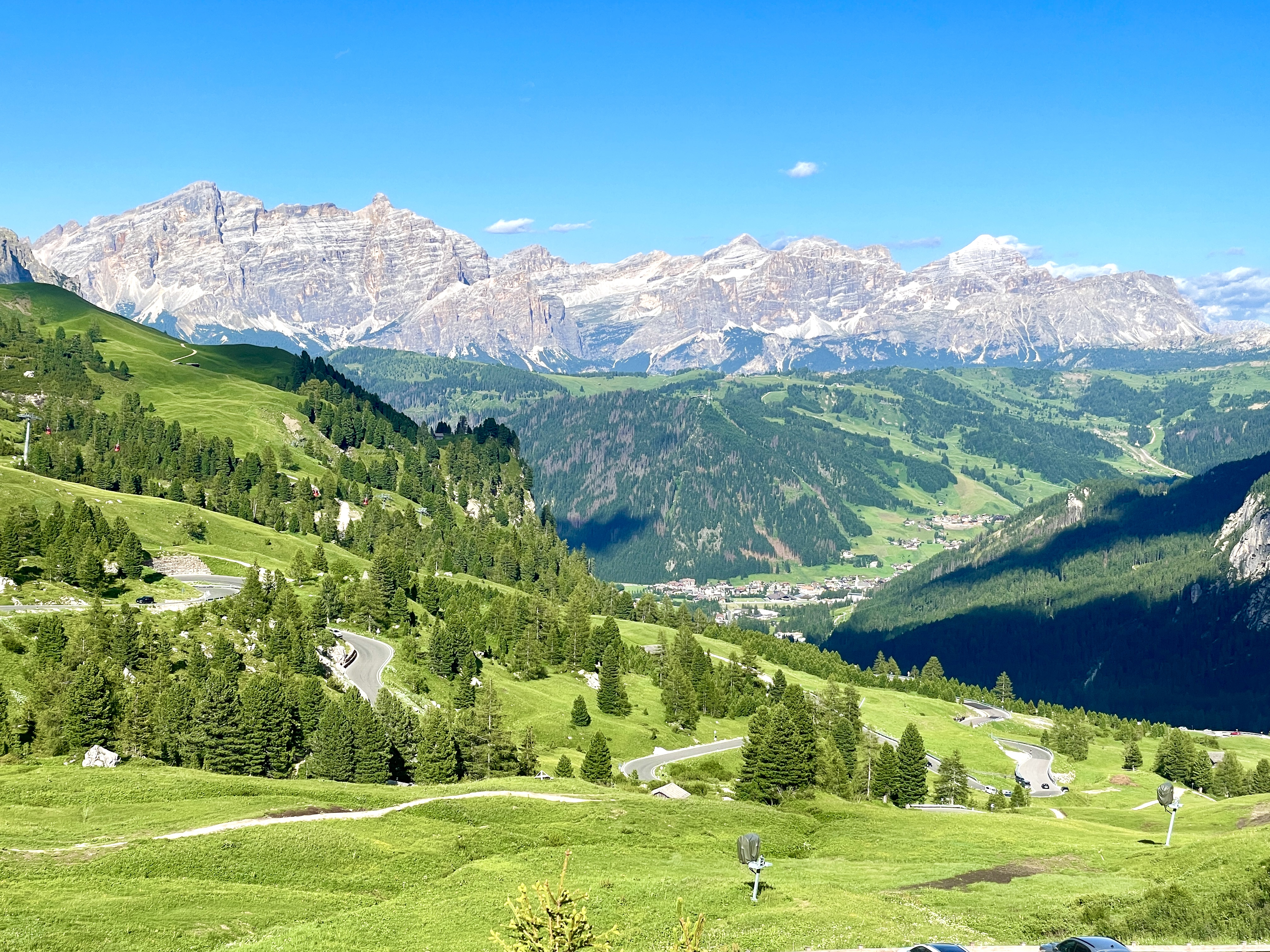 내 무모한 똥고집은 결국 돌로미티 첫 번째 트레킹부터 구겨놓는 결과를 가져왔다. 차를 돌려 당초 구글 네비가 알려주는 우회로를 따라가기로 한다. 40분이면 될 길을 한 시간 반이 넘는 우회로로 가야 한다. 그 우회로는 돌로미티에서 가장 험하다는 파쏘 포르도이와 파소 셀라 두 고개를 넘어야 하는 힘겨운 길이다. 그래도 어쩌랴! 짜증스러운 상황임에도 불구하고 친구들은 긍정 마인드로 날 위로한다. 고마운 친구들의 들뜬 목소리에 묻어 힘들지 않고 오르티세이 곤돌라 탑승장에 도착한다.