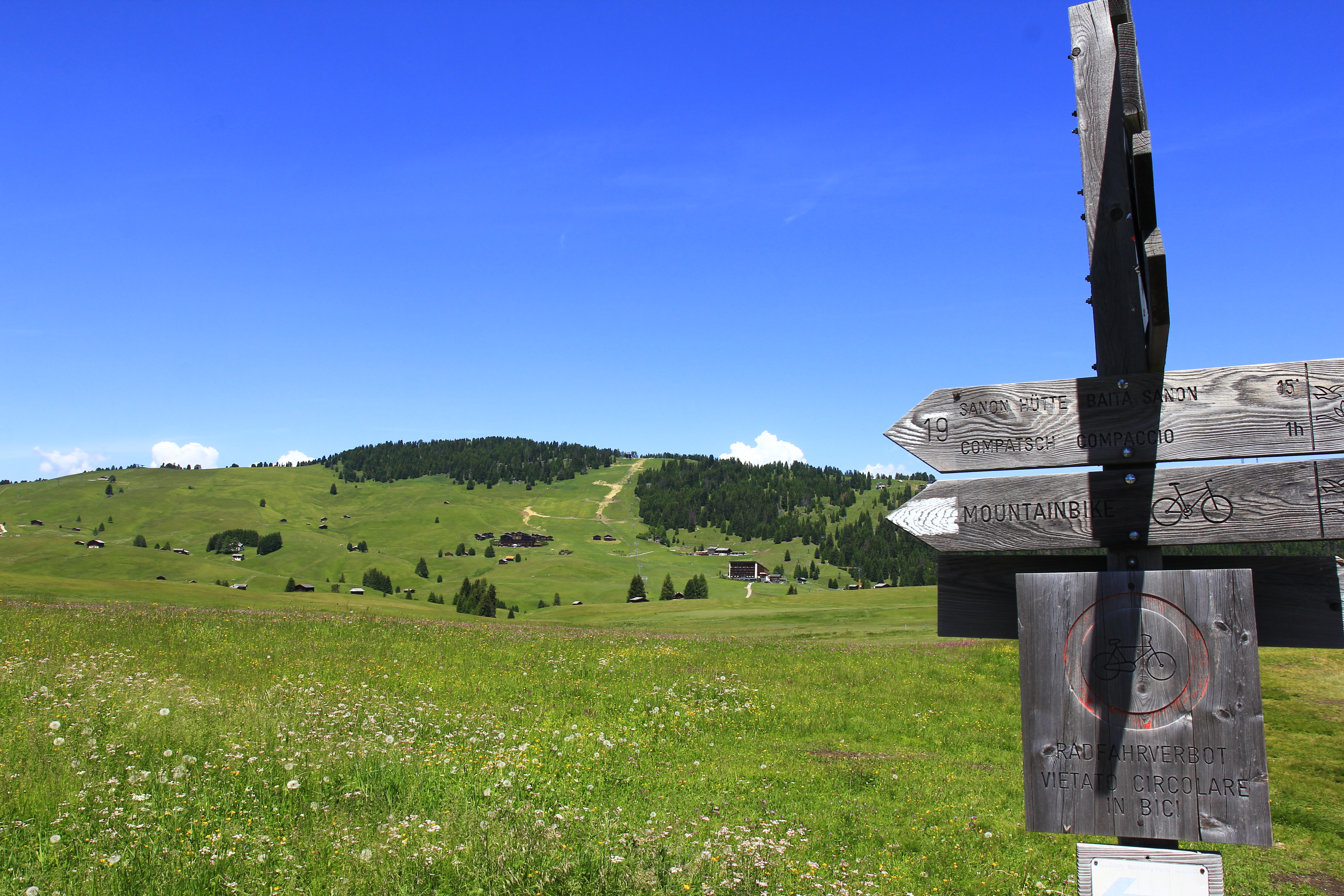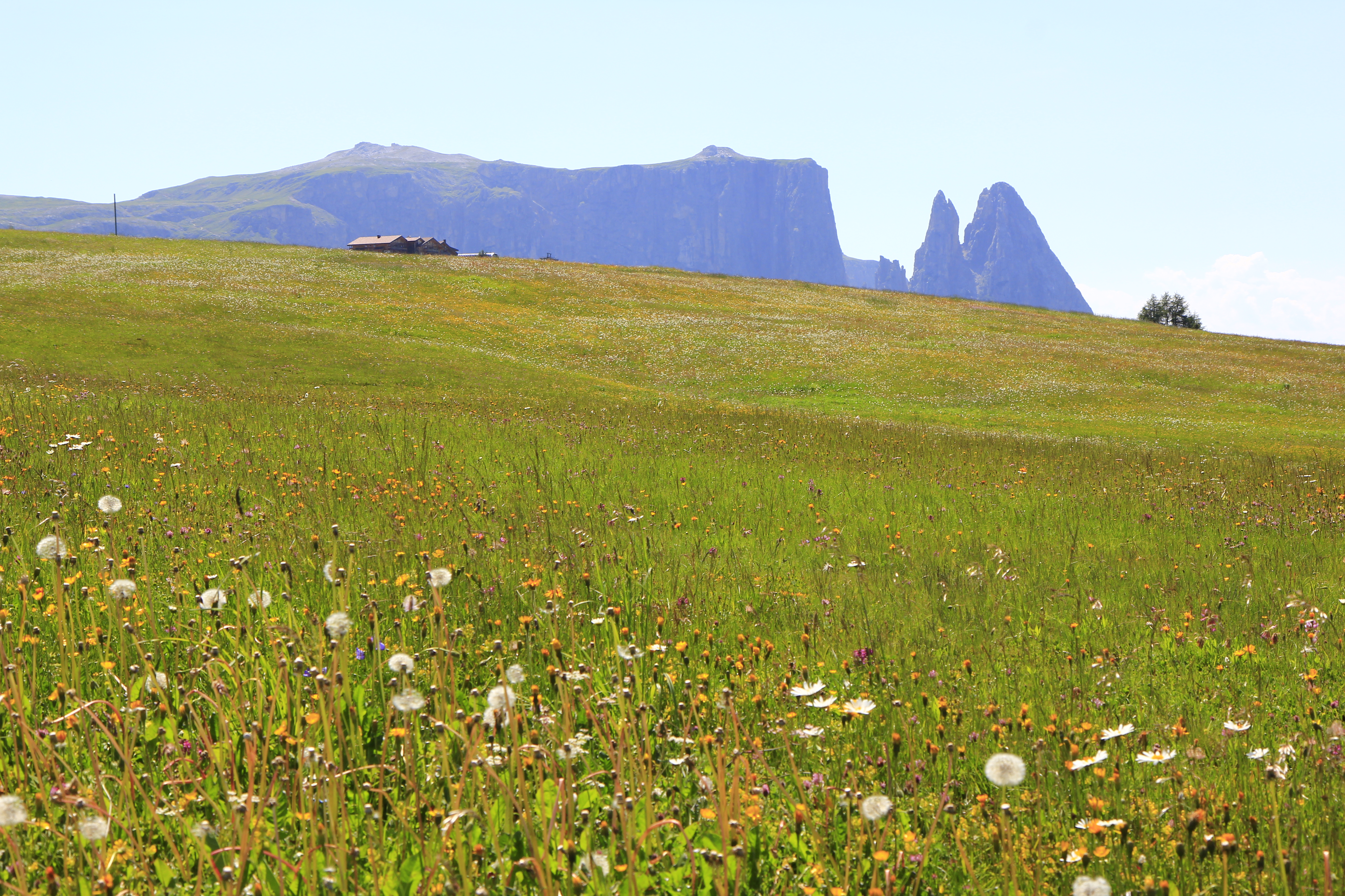 그리고 6월 말에서 7월 초까지 평원에는 야생화가 지천으로 피어오른다. 우리는 오늘 바로 여기 알페 디 시우시로 간다. 알페 디 시우시 접근은 오르티세이에서 곤돌라로 올라오는 방법과 차를 이용해 콤패치(Compatch)로 들어가는 방법이 있다. 콤패치로 들어가려면 09:30 이전에 들어가야 한다. 이후 시간에는 구역 내 호텔에서 숙박하거나 지역 주민을 제외하고 출입이 제한된다.