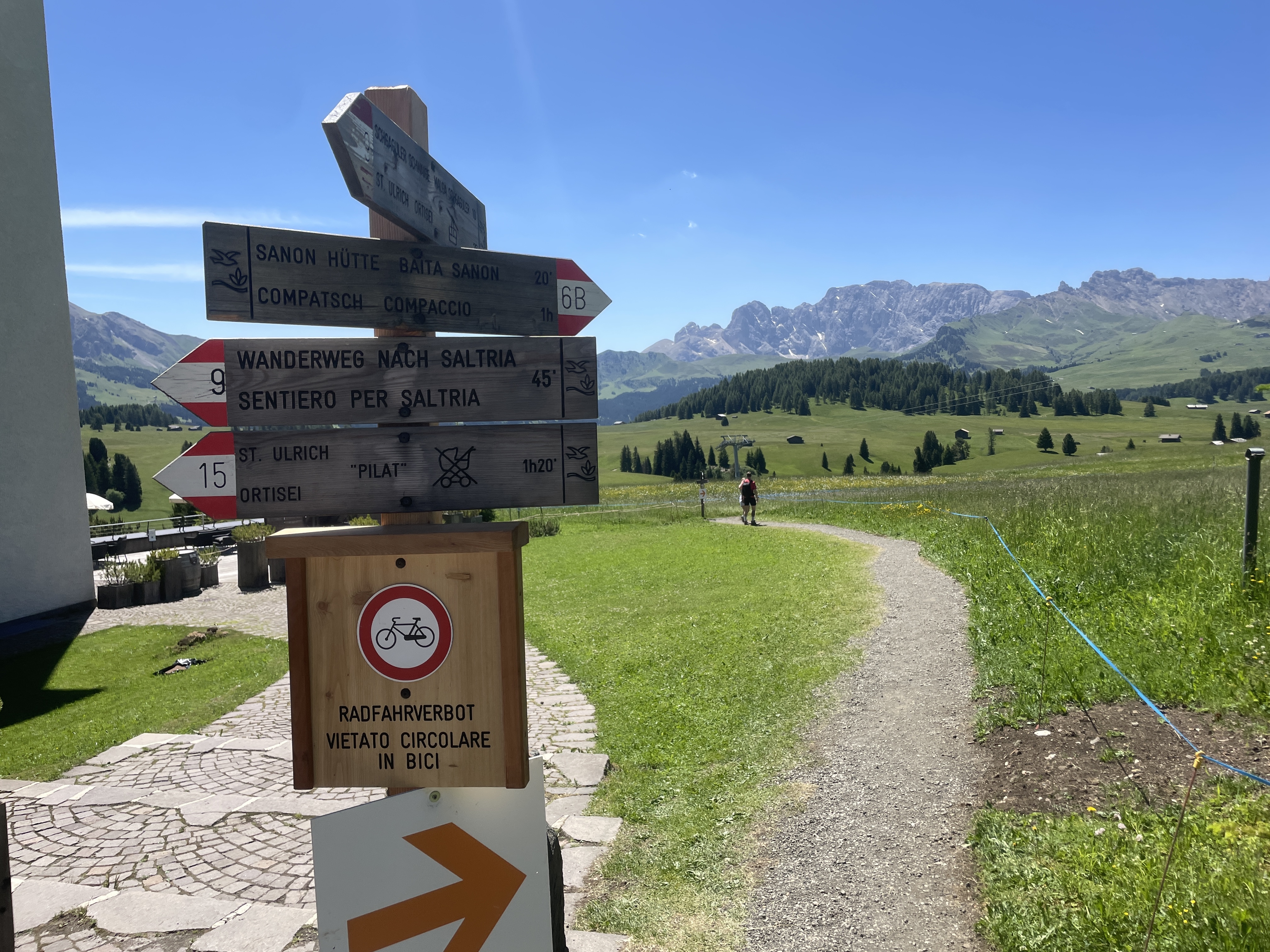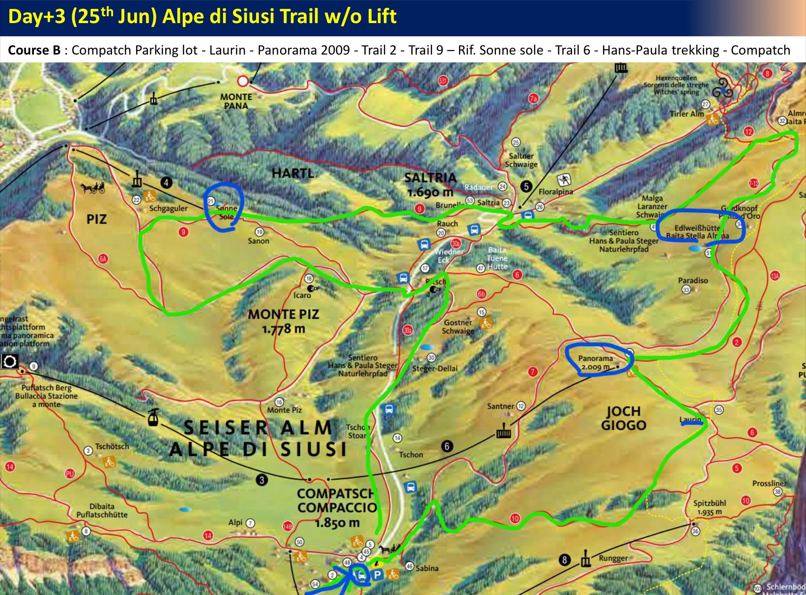 두 번째 코스는 곤돌라를 타지 않고 알페 디 시우시를 순전히 두 다리로 느껴보는 트레일이다. 오전 09:30 전에 콤패치(Compatch) 마을 안 공공주차장에 차를 주차하고 Panorama 2009 - trail 2번 길과 9번 길을 변주하면서 소네호텔까지 다냐오는 길이다. 우리는 오늘 이 코스에 도전해 보려고 한다.