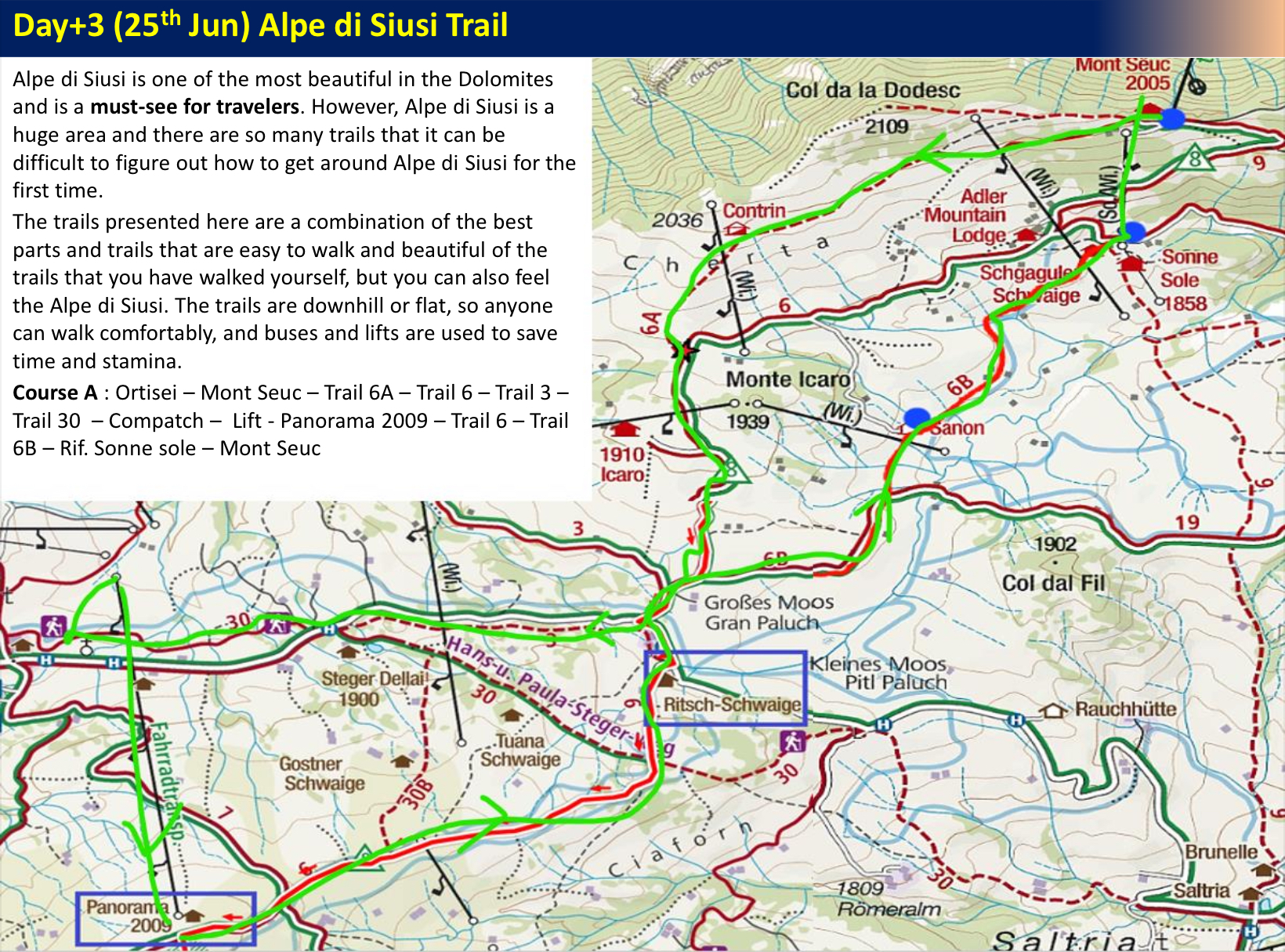 우리는 돌로미티 여행을 준비하면서 맨 첫 번째 트레킹을 알페 디 시우시로 정하고 두 개의 트레킹 코스를 마련하였다. 첫 번째는 돌로미티 전문 블로거? ‘MY WAY(https://blog.naver.com/choigs293)’님이 추천한 코스를 변형한 것이다. 오르티세이에서 곤돌라를 타고 몽트 쉑(Monte Seuc)으로 올라와 compatch - Panorama2009를 다녀오는 코스로서 알페 디 시우시 진수를 느껴볼 수 있다.