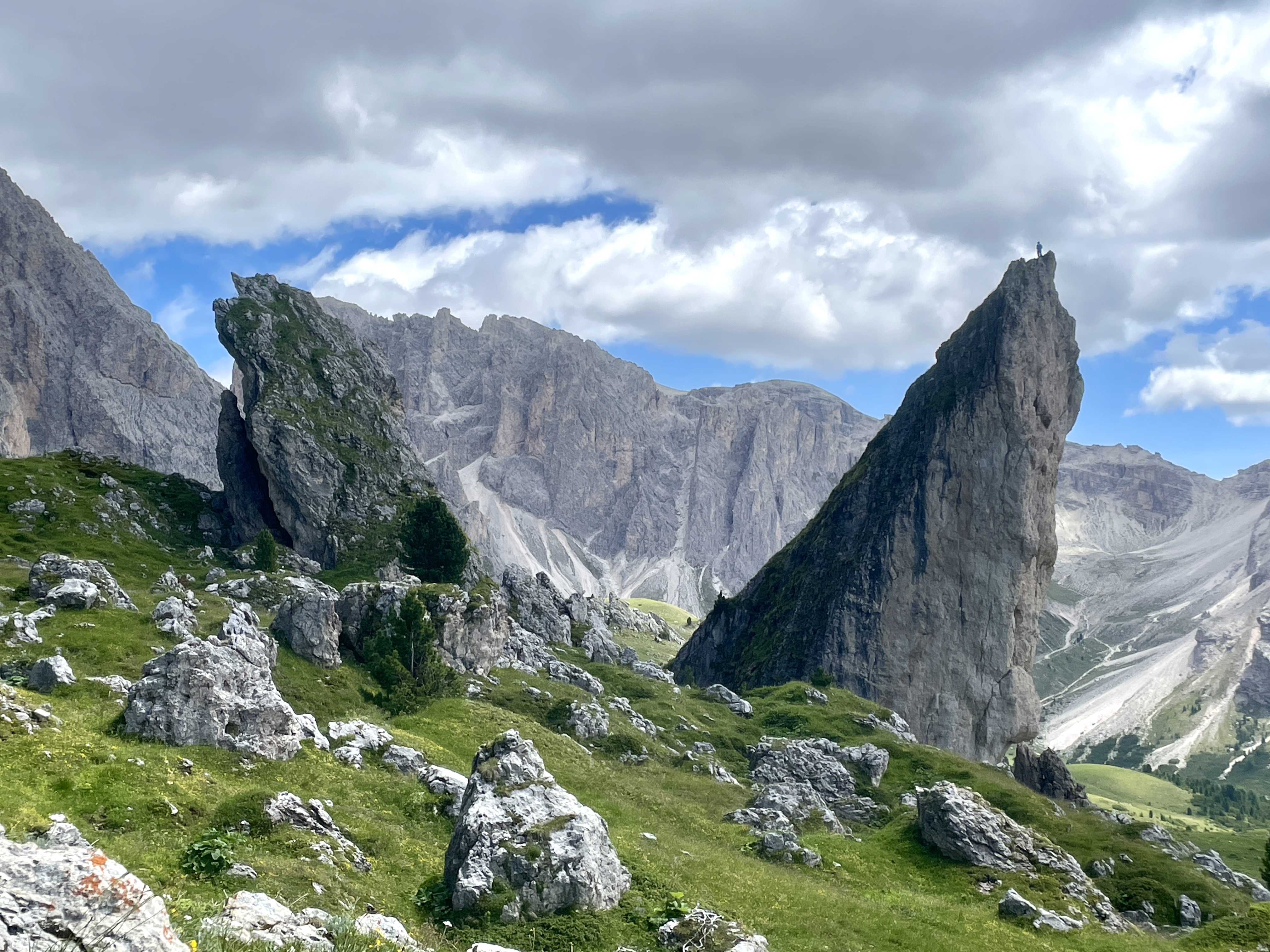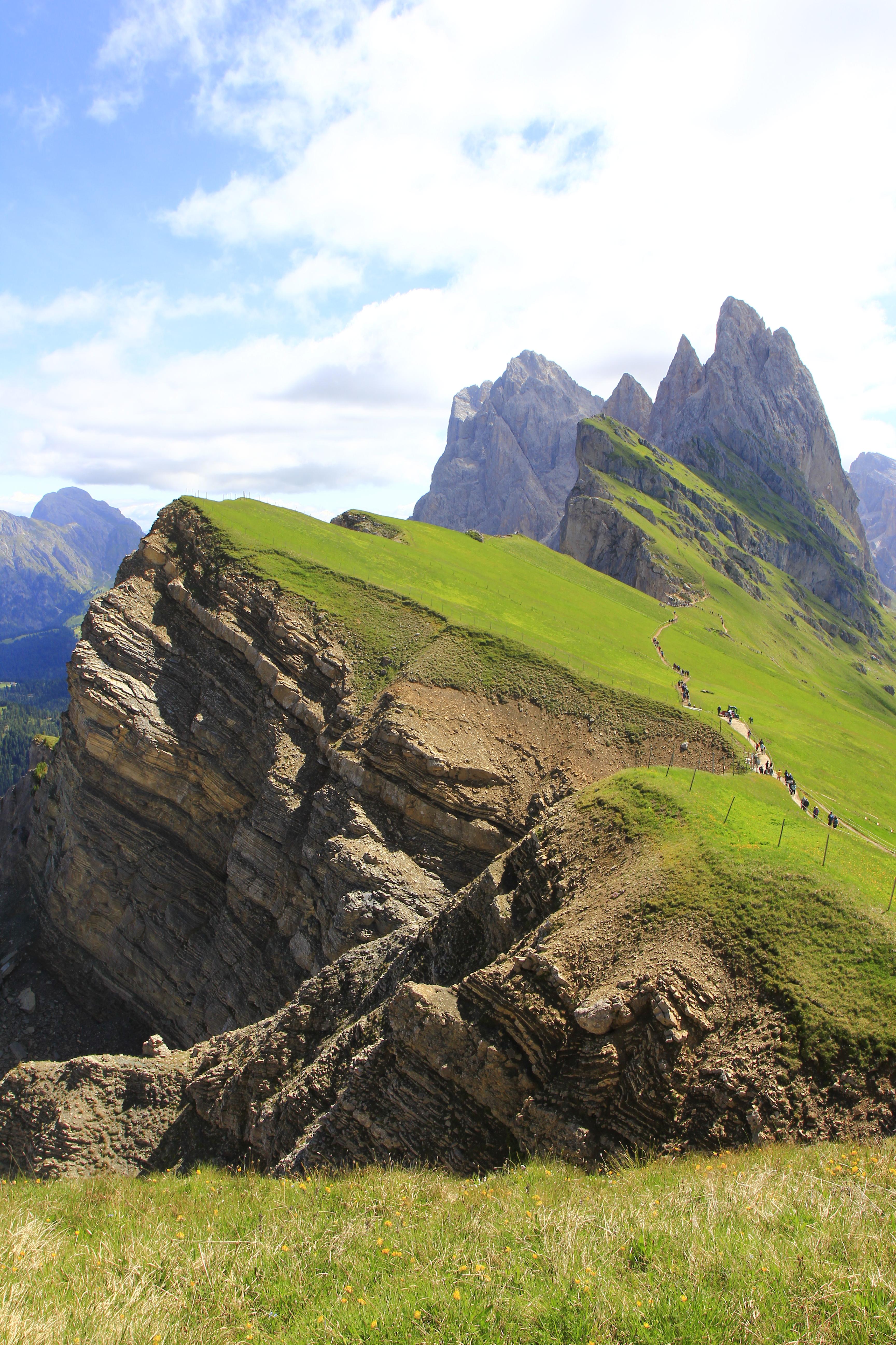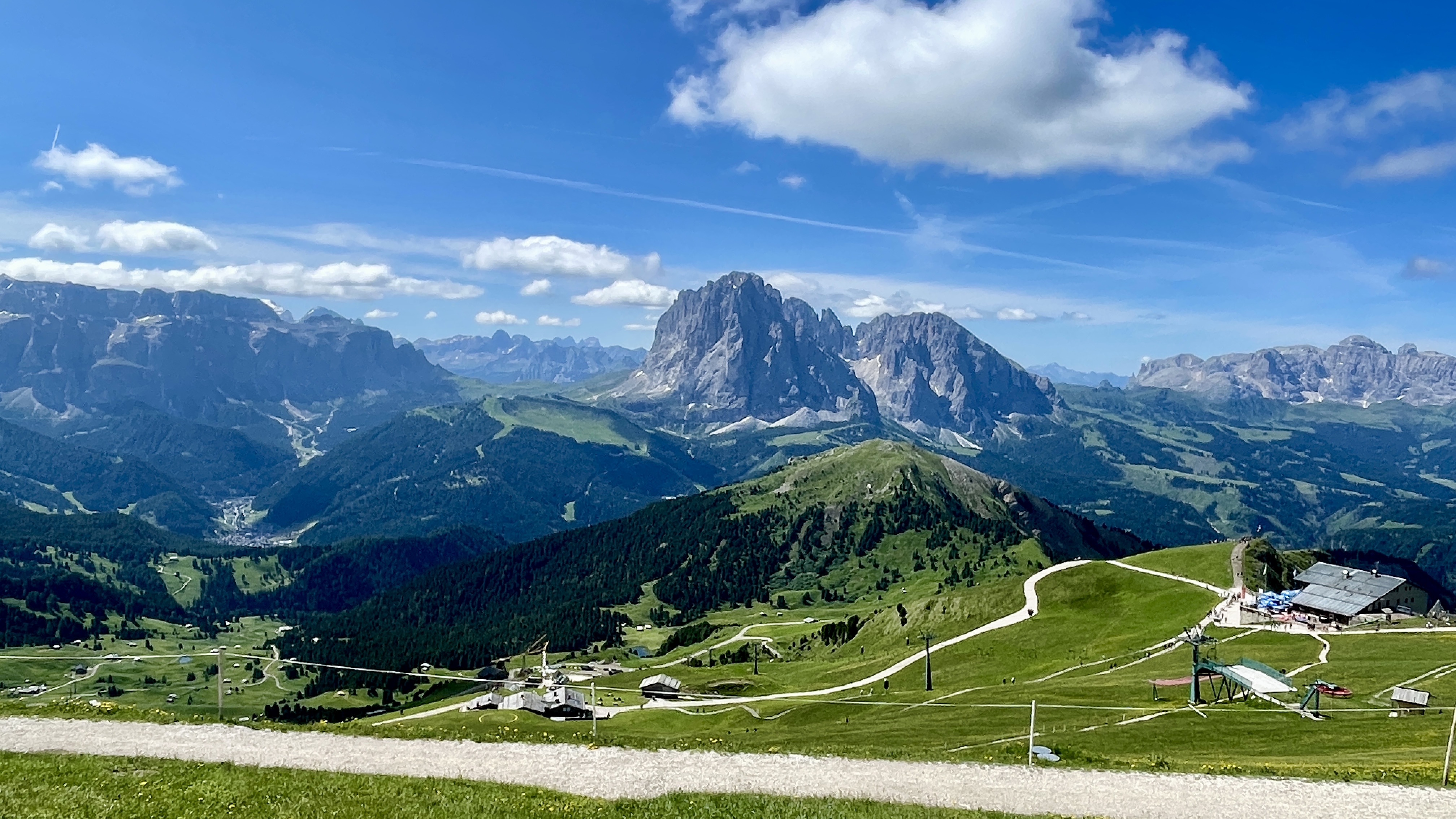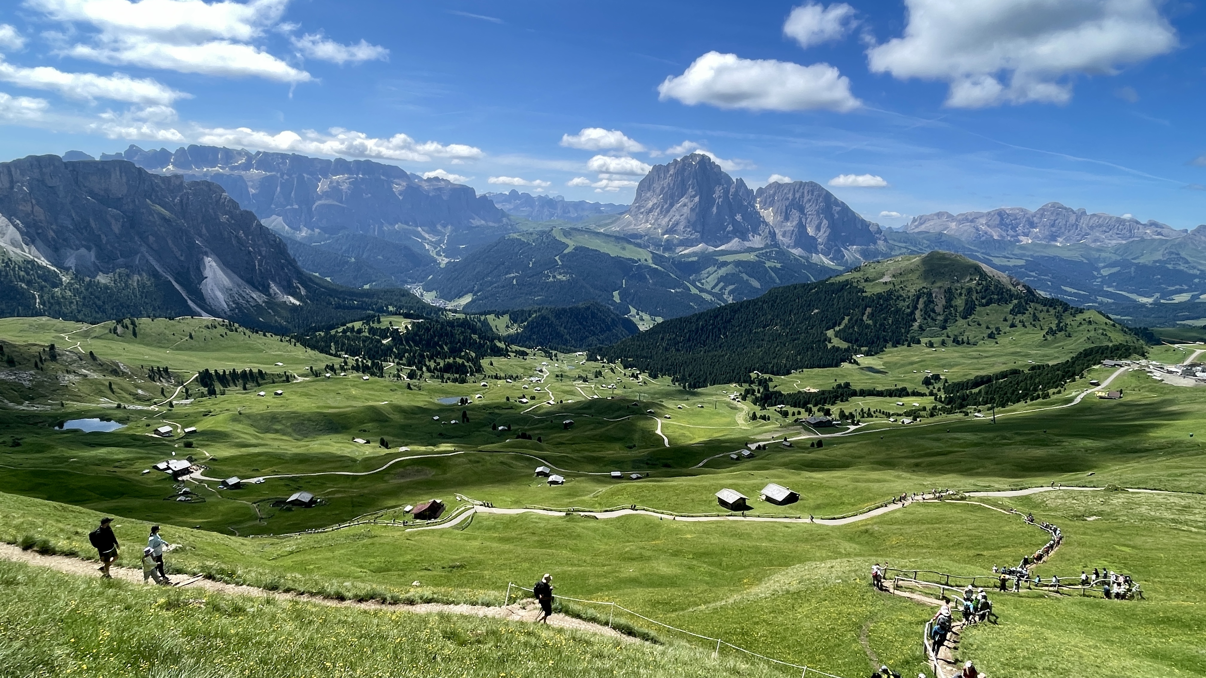 날카롭게 솟구친 봉우리들에서 시원스레 흘러내려온 푸르른 평원엔 드문드문 앙증맞게 엎드려있는 축사와 산장을 트레일이 유유히 이어주고 있다. 흘러내려간 평원 끝자락엔 단단한 근육을 자랑하는 싸소룽고 봉우리가 장엄한 광경에 정점을 찍고 서있다. 돌로미티 홈페이지에서 이 광경을 단 두 단어로 말한다, INCREDIBLE SCENERY!!