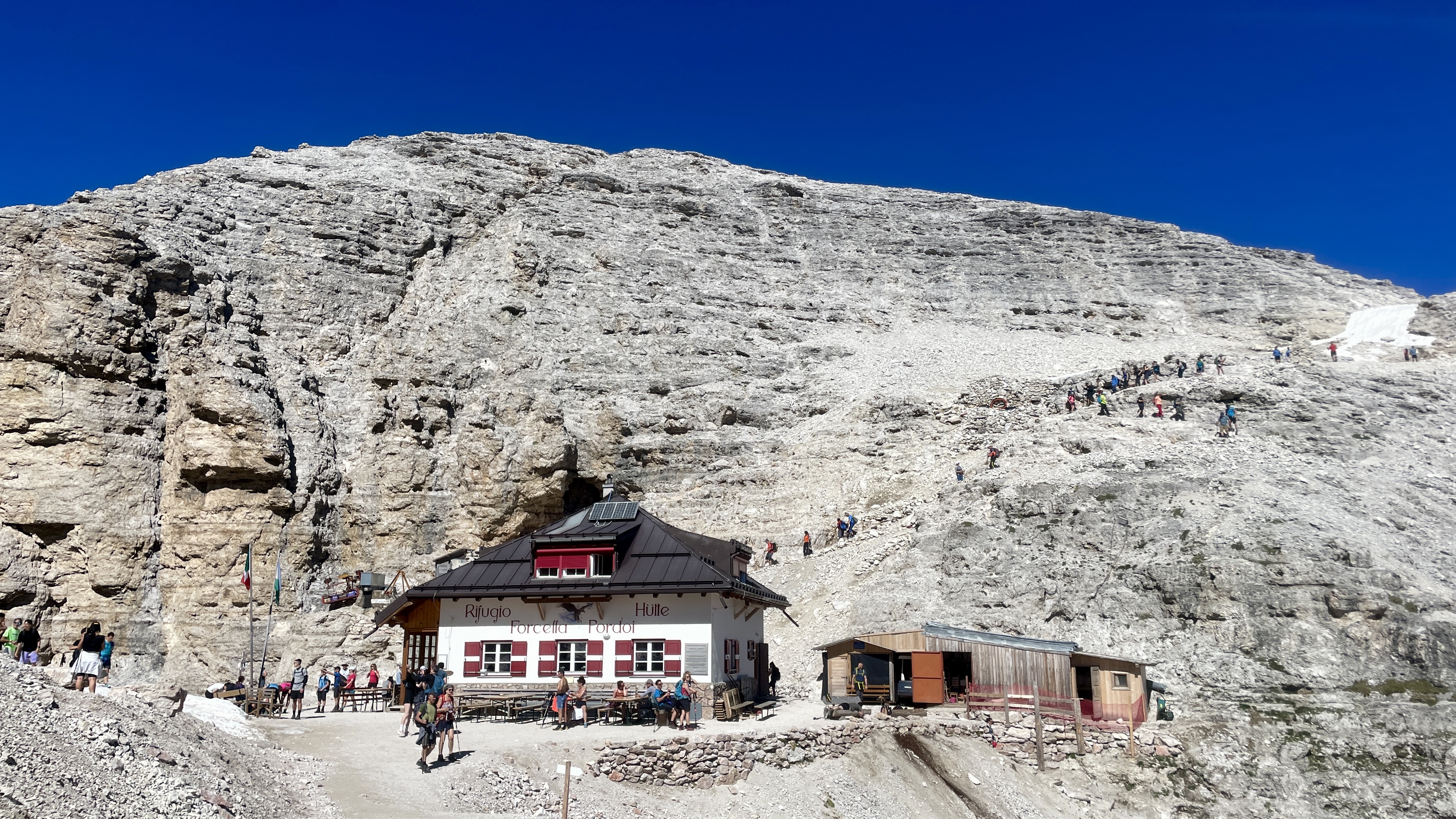 전혀 현실적이지 않을 낙하장면을 직관한 감동에서 벗어나 천천히 트레일을 따라 발길을 옮겨본다. 혹시나 고산증세를 겪을까 싶어 친구 화는 서두르지 말고 천천히 걸어가라고 연신 채근한다. 내 인생에서 가장 하늘을 가까이 이고 걷기에 친구 화의 채근이 고맙다. 길은 내리막으로 변해 포르첼라산장(Rifugio Forcella)으로 이어진다.