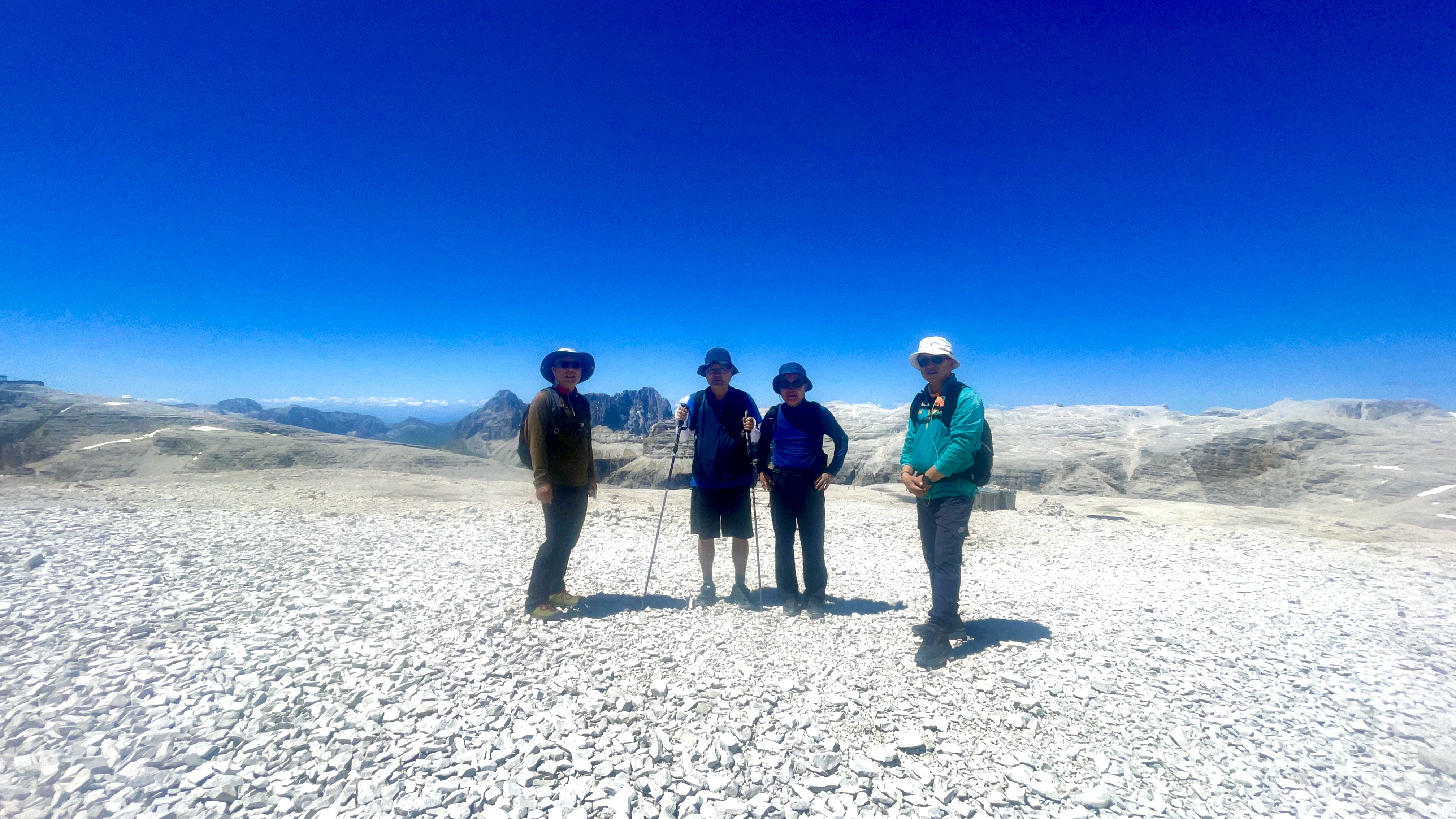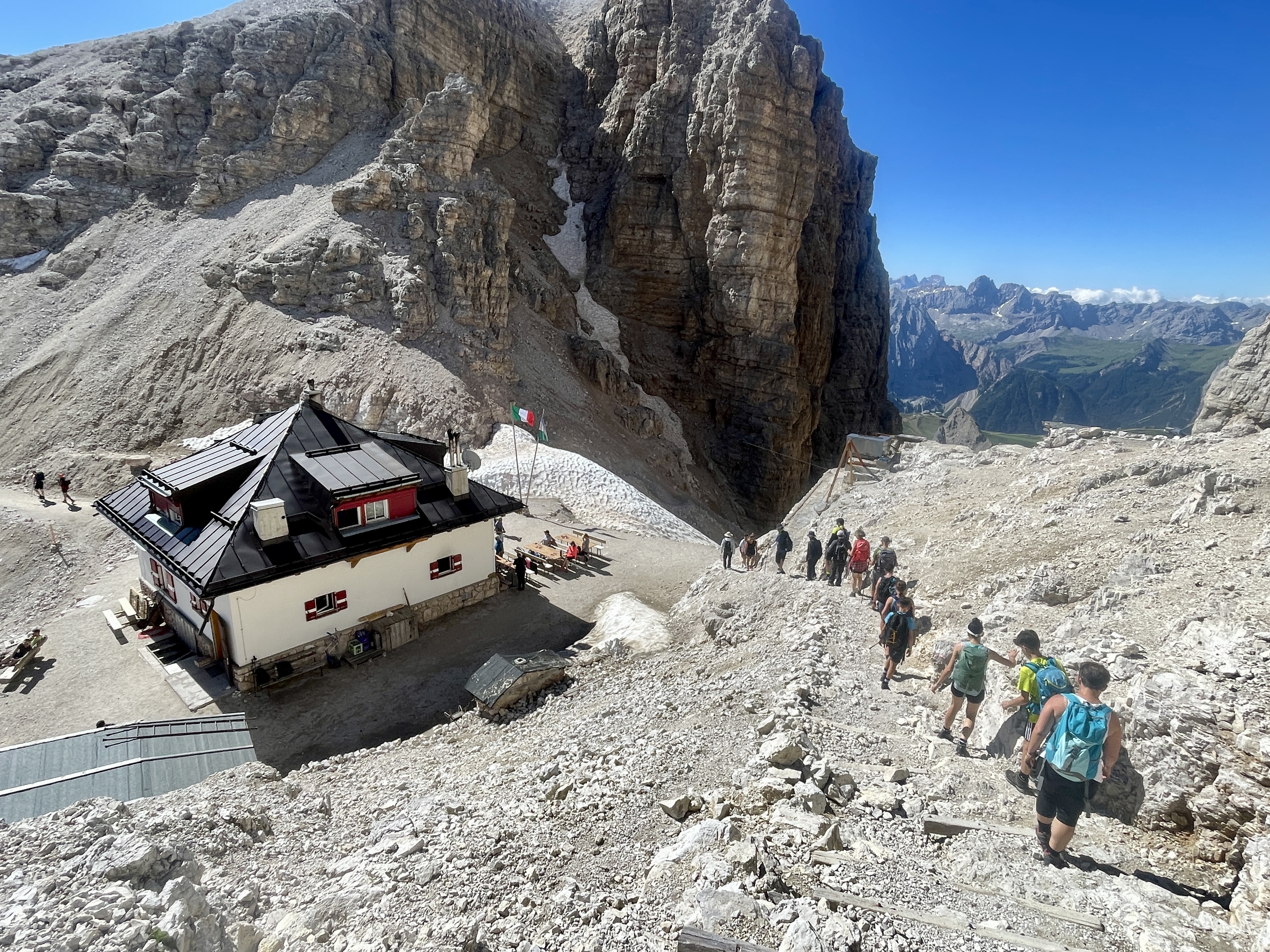 산장에 내려오니 Alta Via 2 트레일로 알려진 길이 파쏘 포르도이로 이어진다. 우리는 케이블카를 타고 올라와 걷는데도 힘겨운데 급경사를 지그재그로 걸어서 올라오고 또 내려간다. 화의 리드에 따라 천천히 산장을 지나 정상으로 나아가면서 뒤를 돌아보니 우리가 케이블카를 내린 마리아산장이 두툼한 암봉 정상에 자그맣게 보인다.