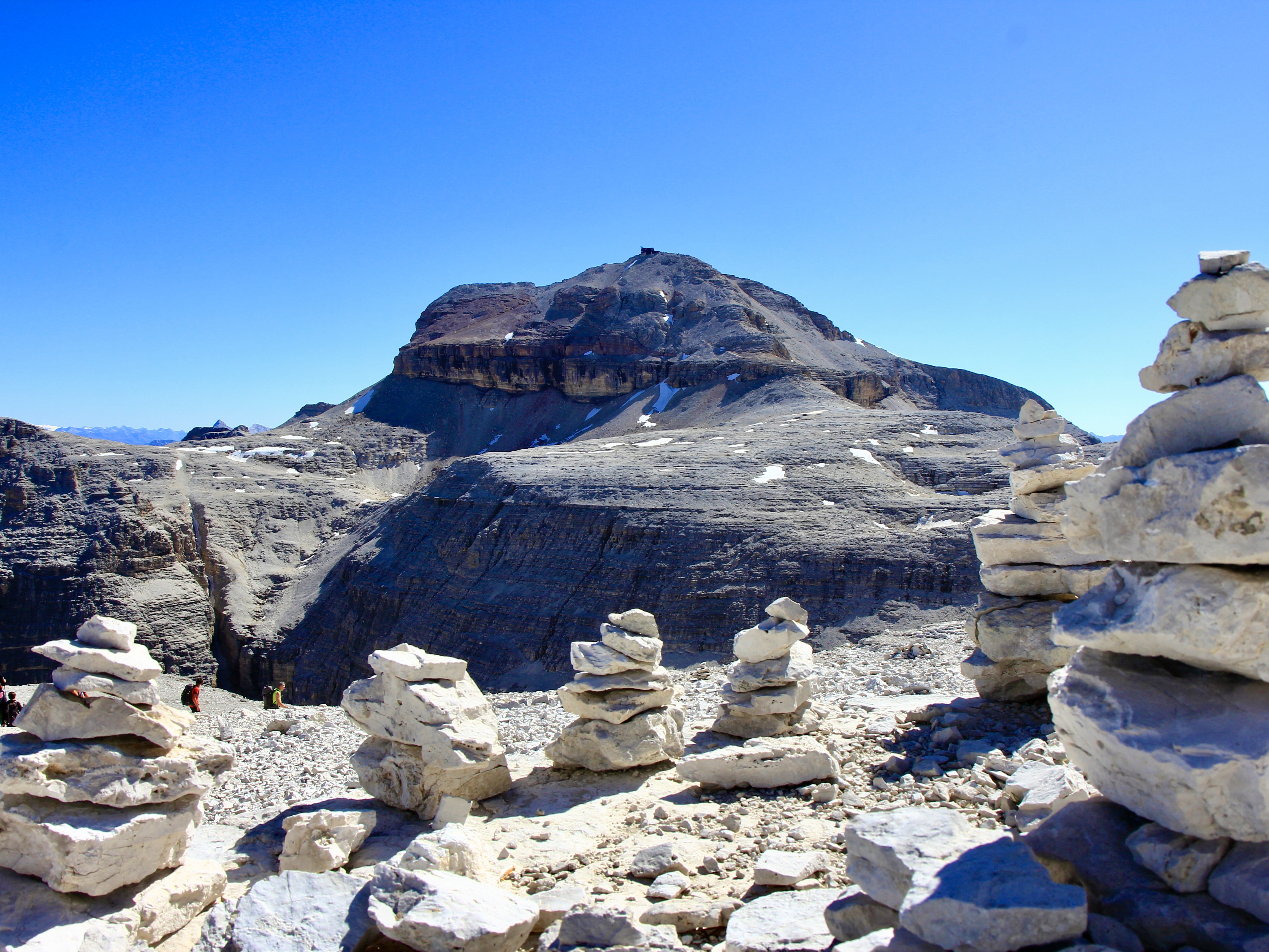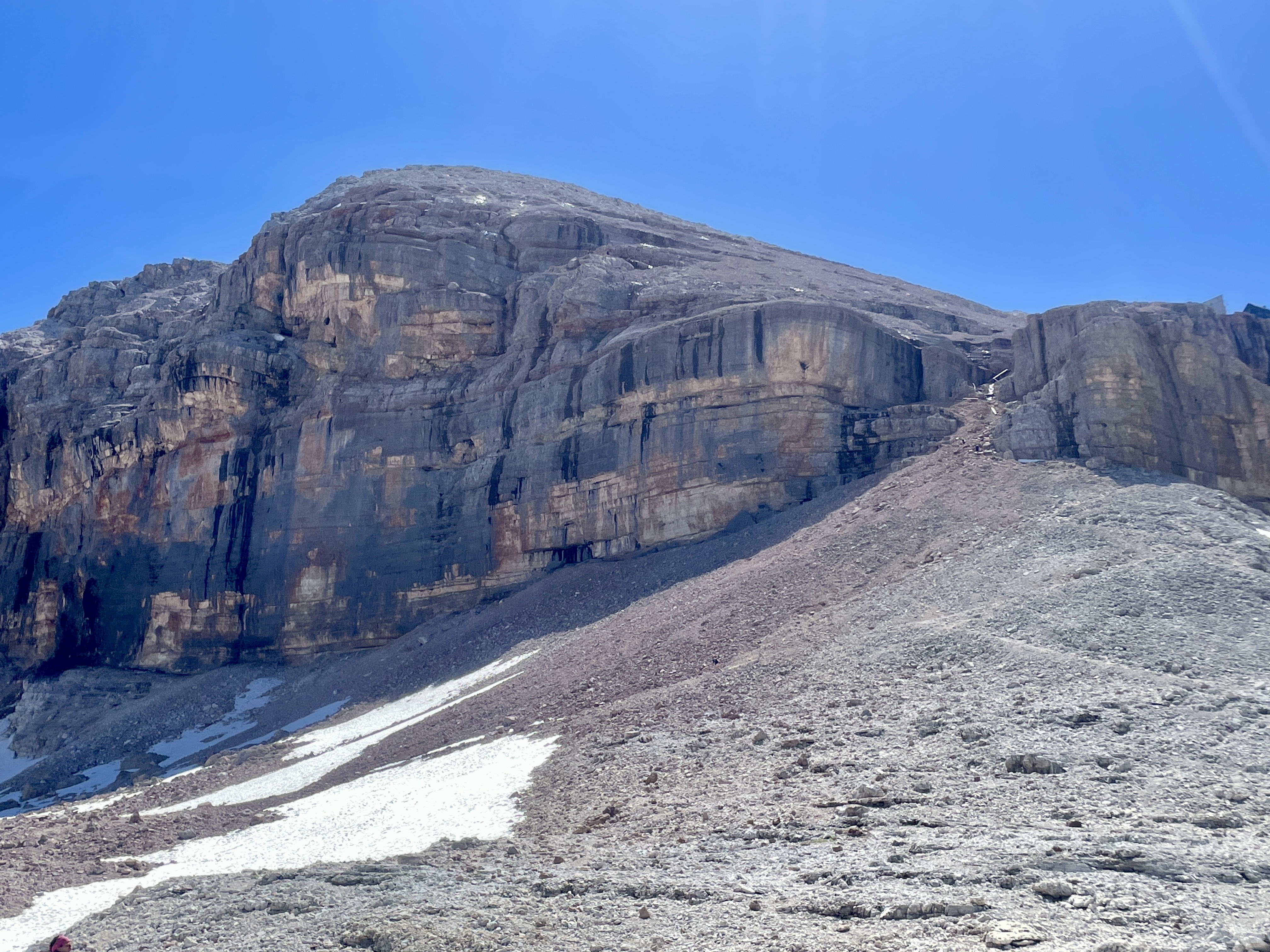 마리아산장을 출발한 지 거의 두 시간 만에 627 트레일을 따라 보에산장(Rifugio Boe)이 보이는 언덕까지 왔다. 여기서 627 트레일에서 벗어나 정상으로 올라가는 638번 트레일로 갈아탄다. 정상이 3,152m니 산술적으로 300미터도 안 되는 고도를 올라가건만 심리적으론 까마득하다.