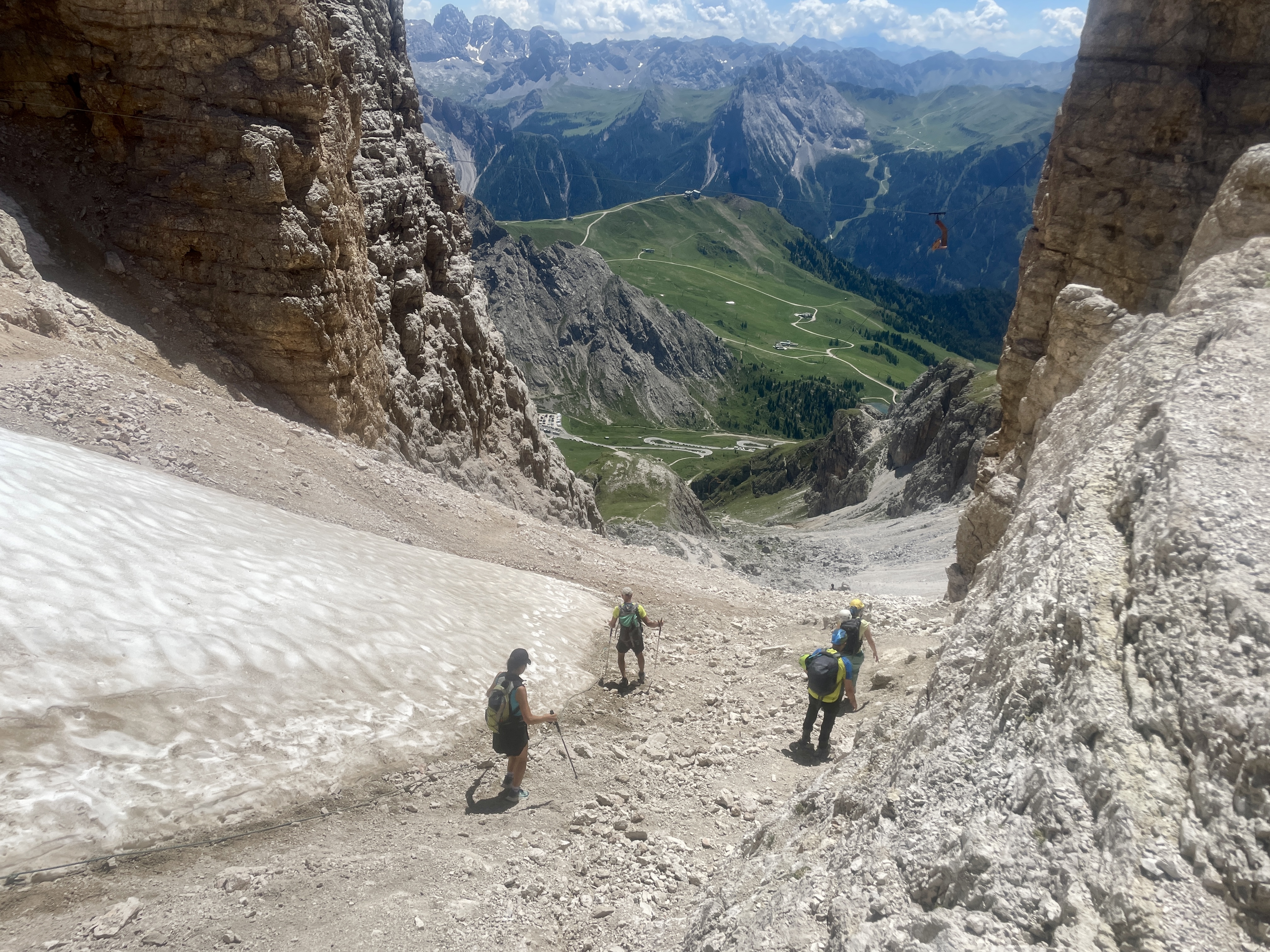 파쏘 포르도이에서 케이블카를 타고 올라와 마리아산장에 내리니 2,950m가 확 눈에 들어온다. 지금부터 걷는 길은 내게 해발고도 기록을 경신하는 그 자체. 산장 밖으로 나와 주변을 둘러보는데 어제 다녀온 비엘 델 판 능선이 발아래로 보인다.