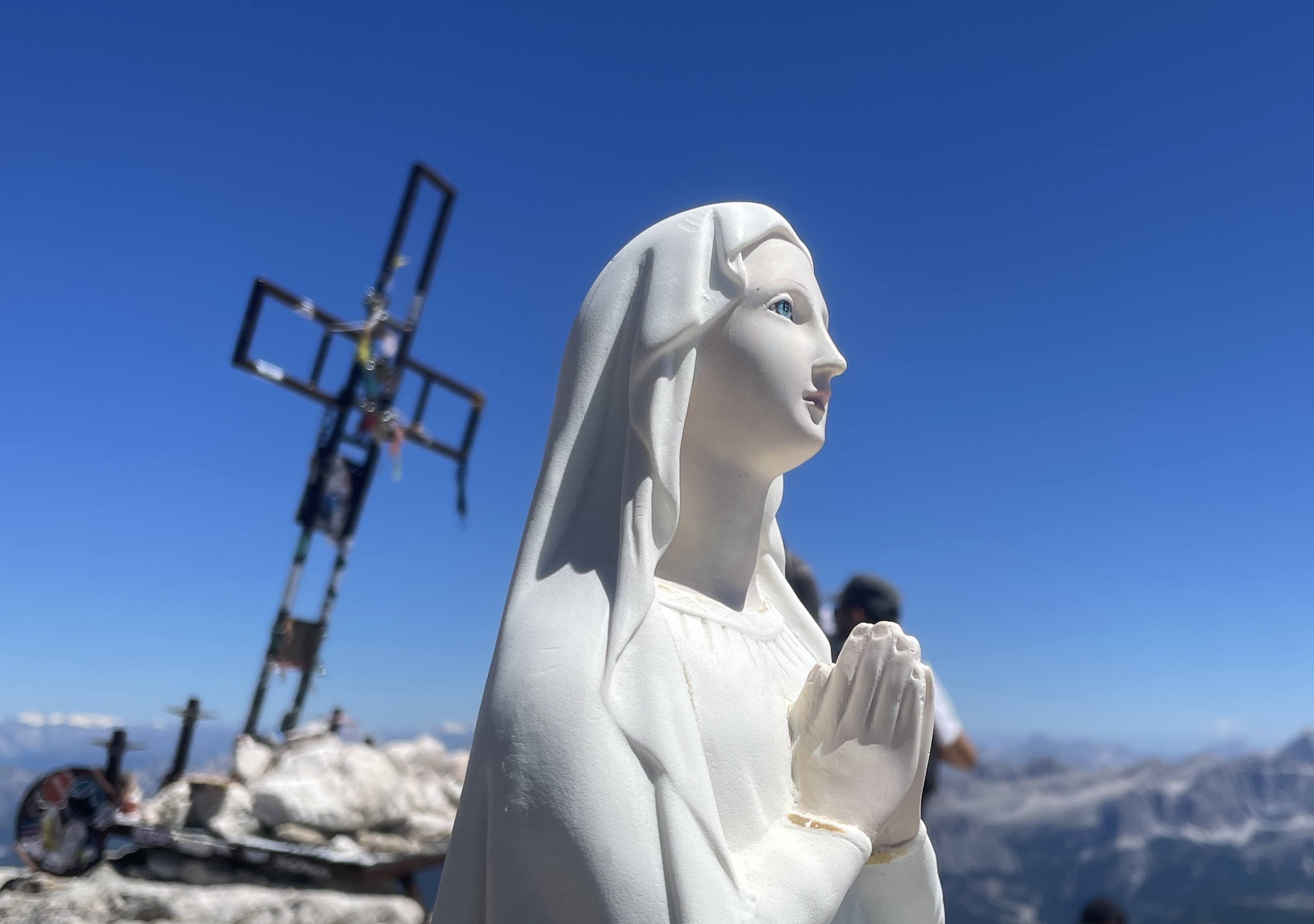 맥주를 즐기며 올라오는동안 소진된 기력을 회복하고 다신 원점회귀 하산길을 나선다. 경사진 길에는 잡석들이 무질서하게 채워져있다. 산장 앞에는 십자가와 함께 마리아상이 서있다. 오늘까지 돌로미티를 여행하는동안 마리아상이 서있는 곳은 이곳이 유일하다.