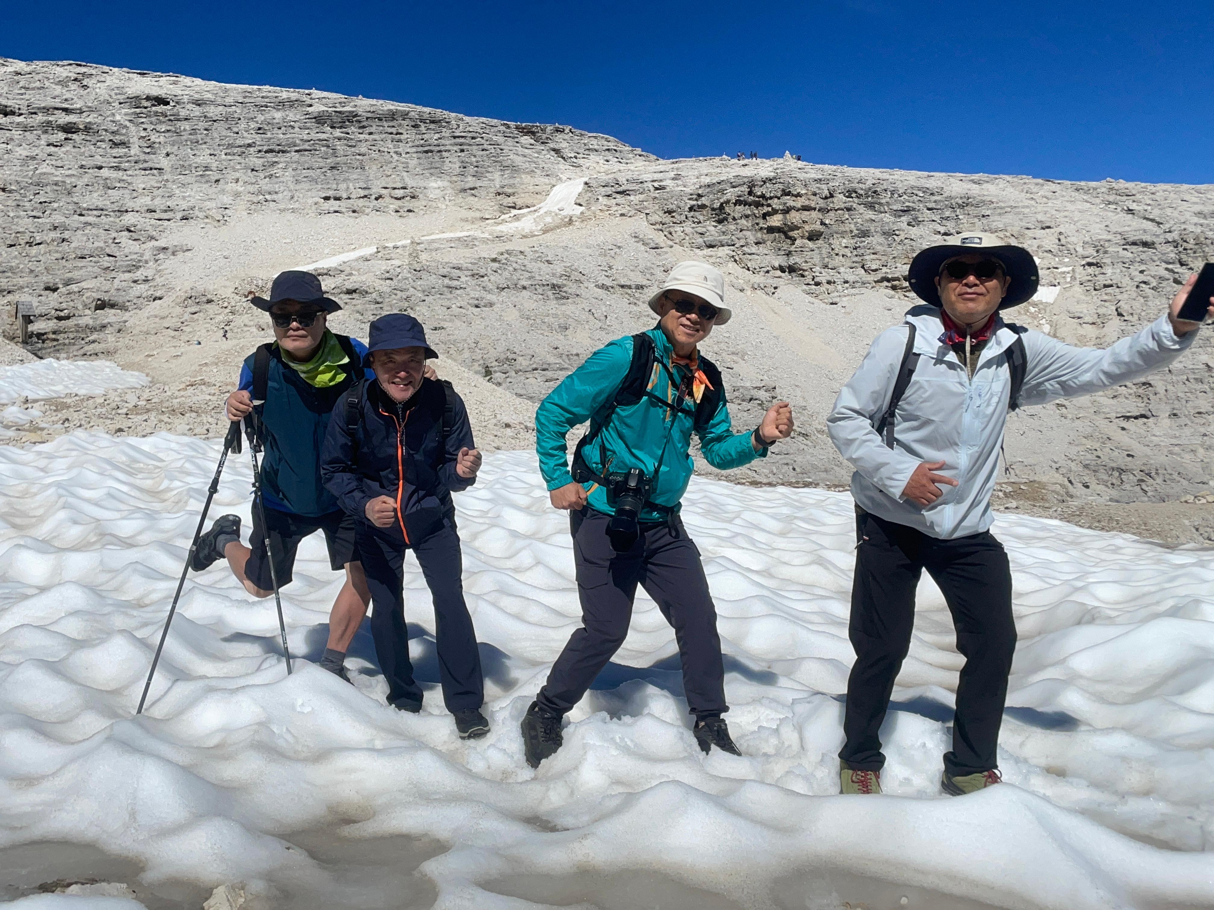 믿음직한 리더를 따라 천천히 서두르지않고 한발 한발 앞으로 나아간다. 저 아래엔 30도를 웃도는 기온인데 여긴 아직도 눈이 녹지않고 남아있다. 잠시 눈위에서 장난스런 포즈로 힘든 트레킹을 잊어본다.