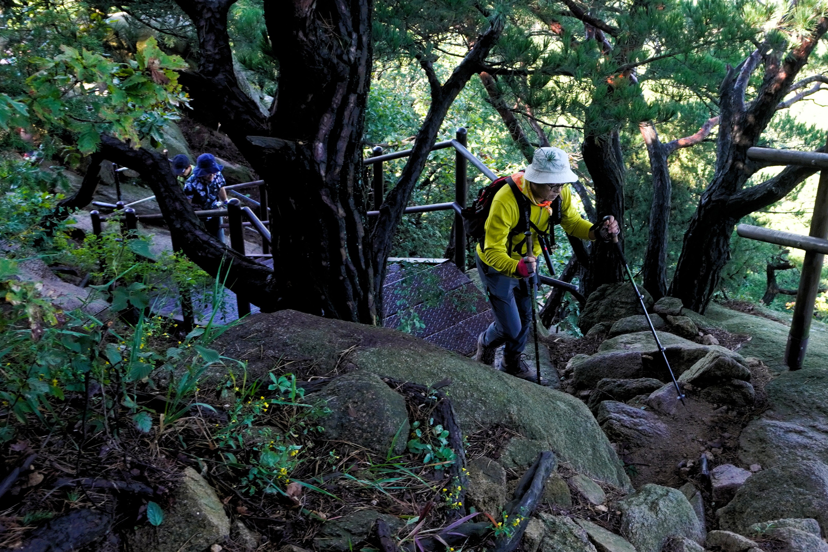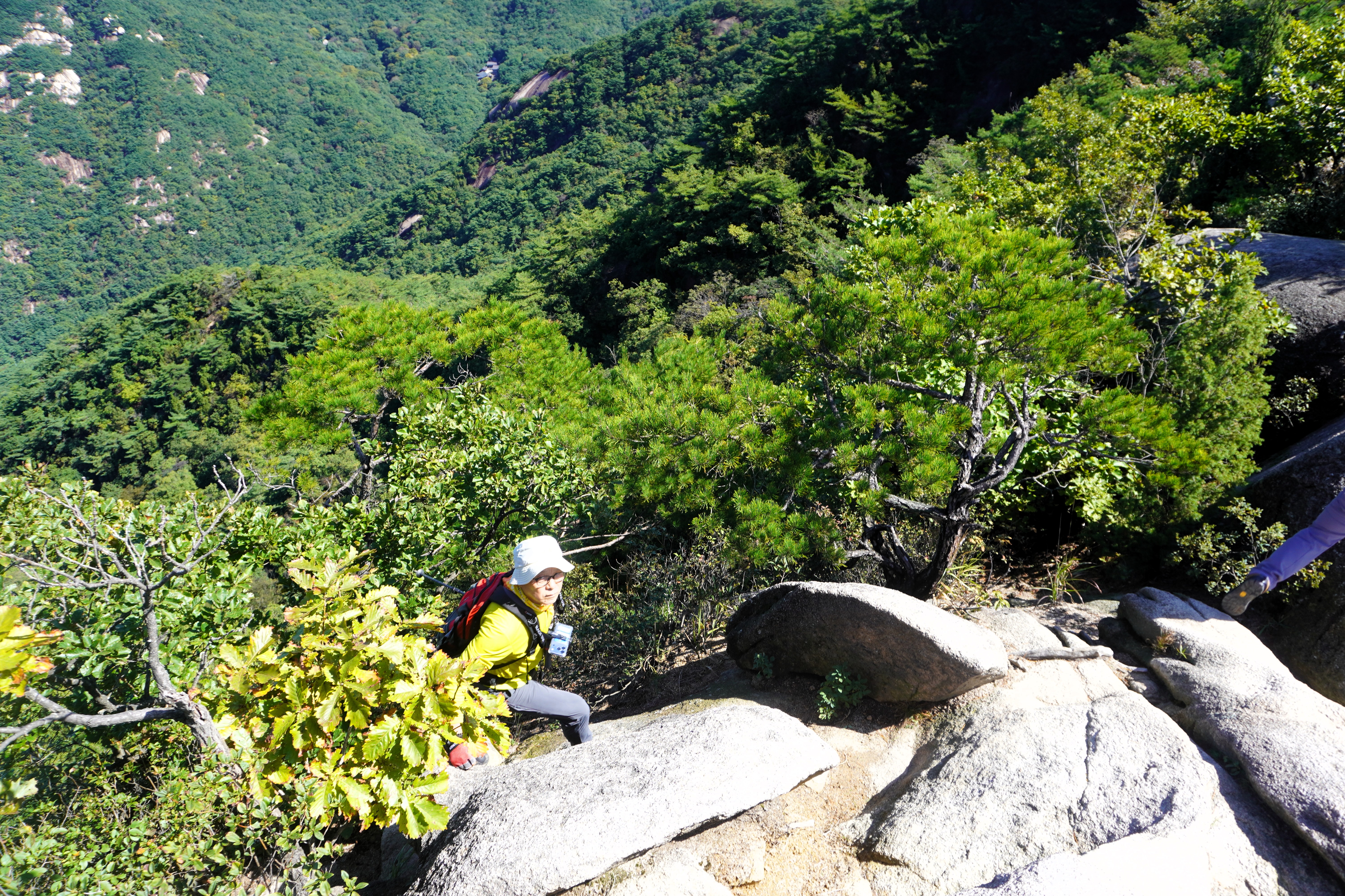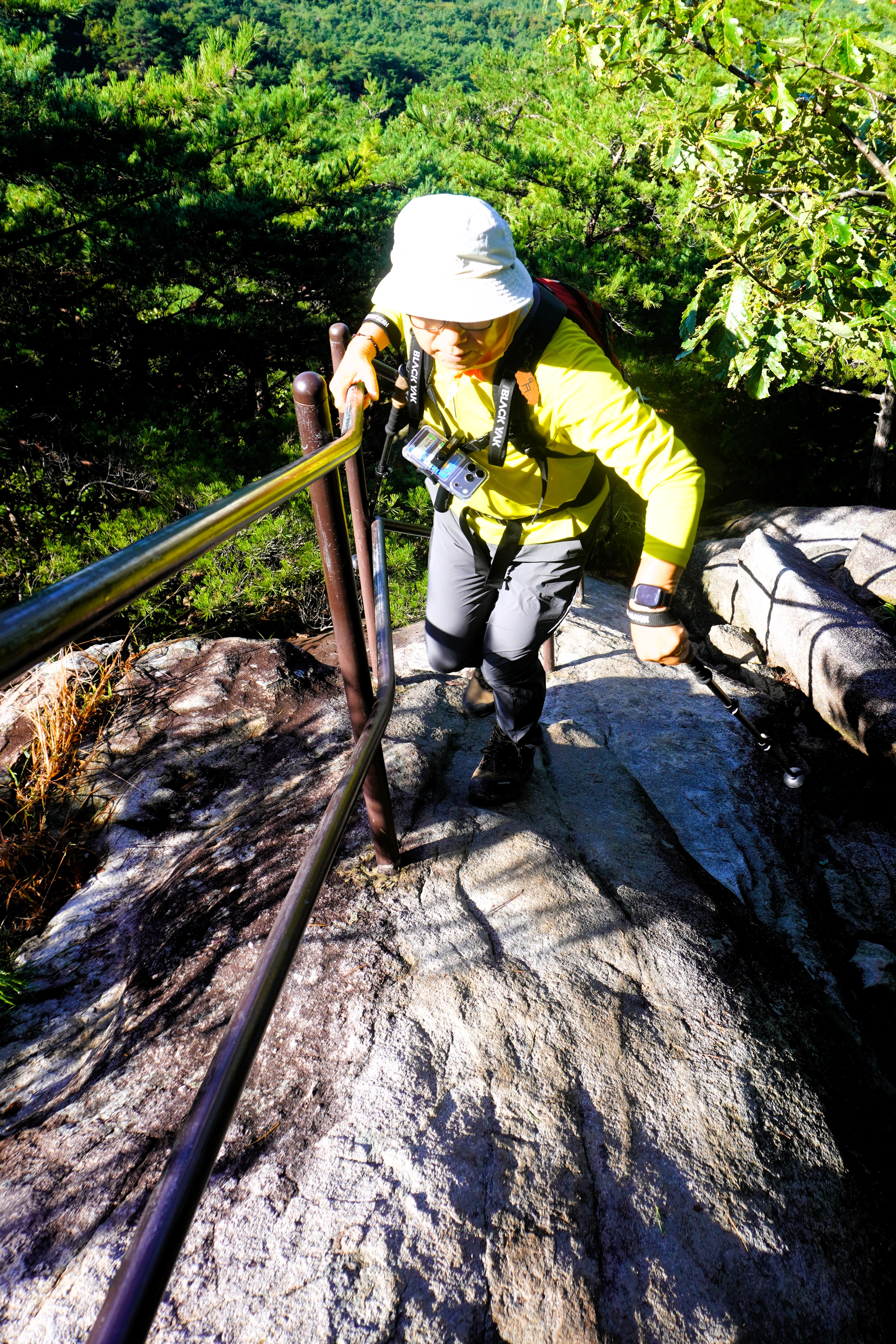 백화사길 합류지점을 지나면서 본격적인 오름이 시작된다. 철계단도 오르고, 너럭바위지대엔 철봉을 잡고 올라가야 한다. 한참을 쇠줄과 철계단과 씨름하며 올라가는데 속이 메스껍게 올라온다. 시작부터 너무 기력을 소진한 탓일까? 나이 탓일까?