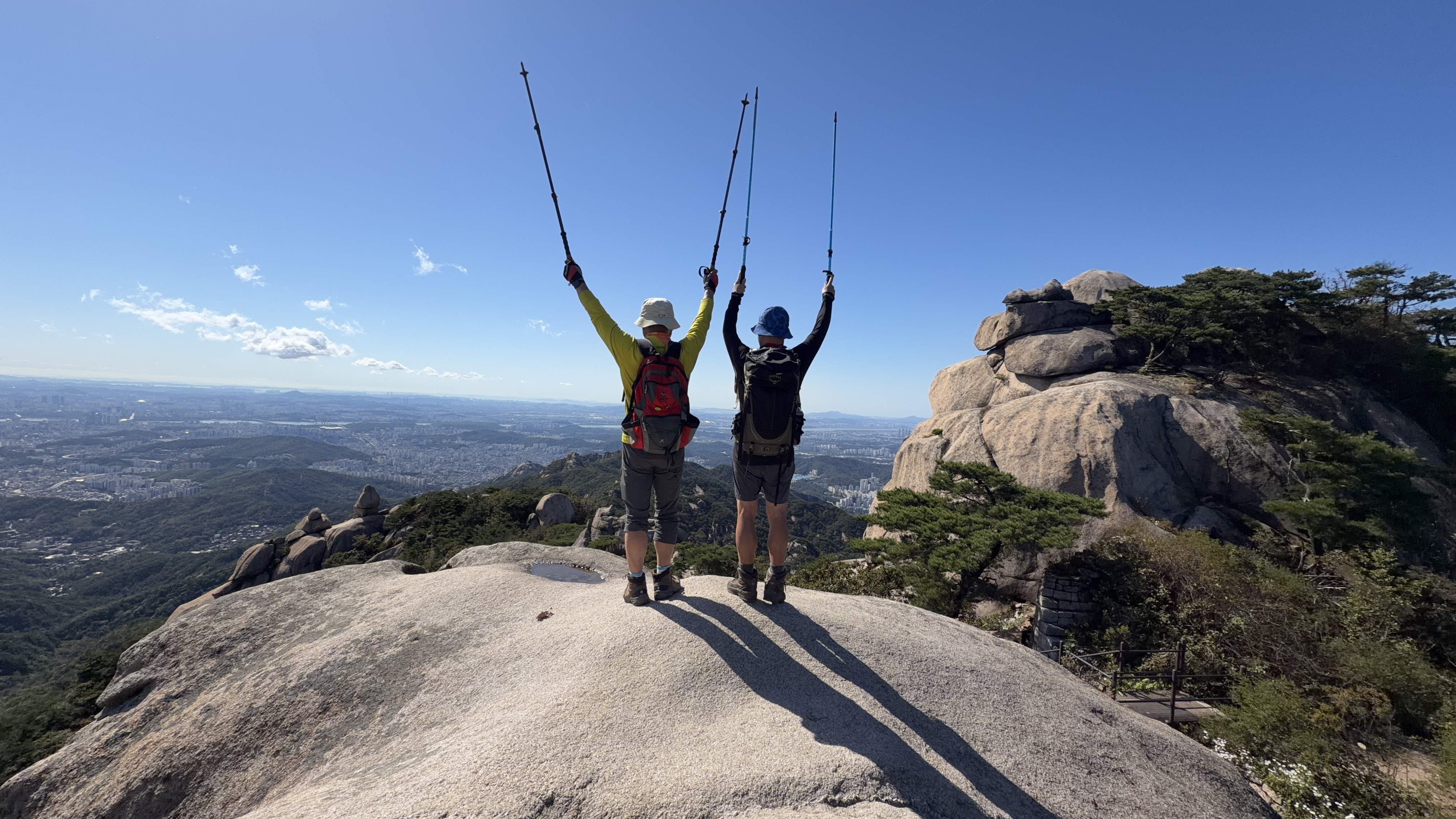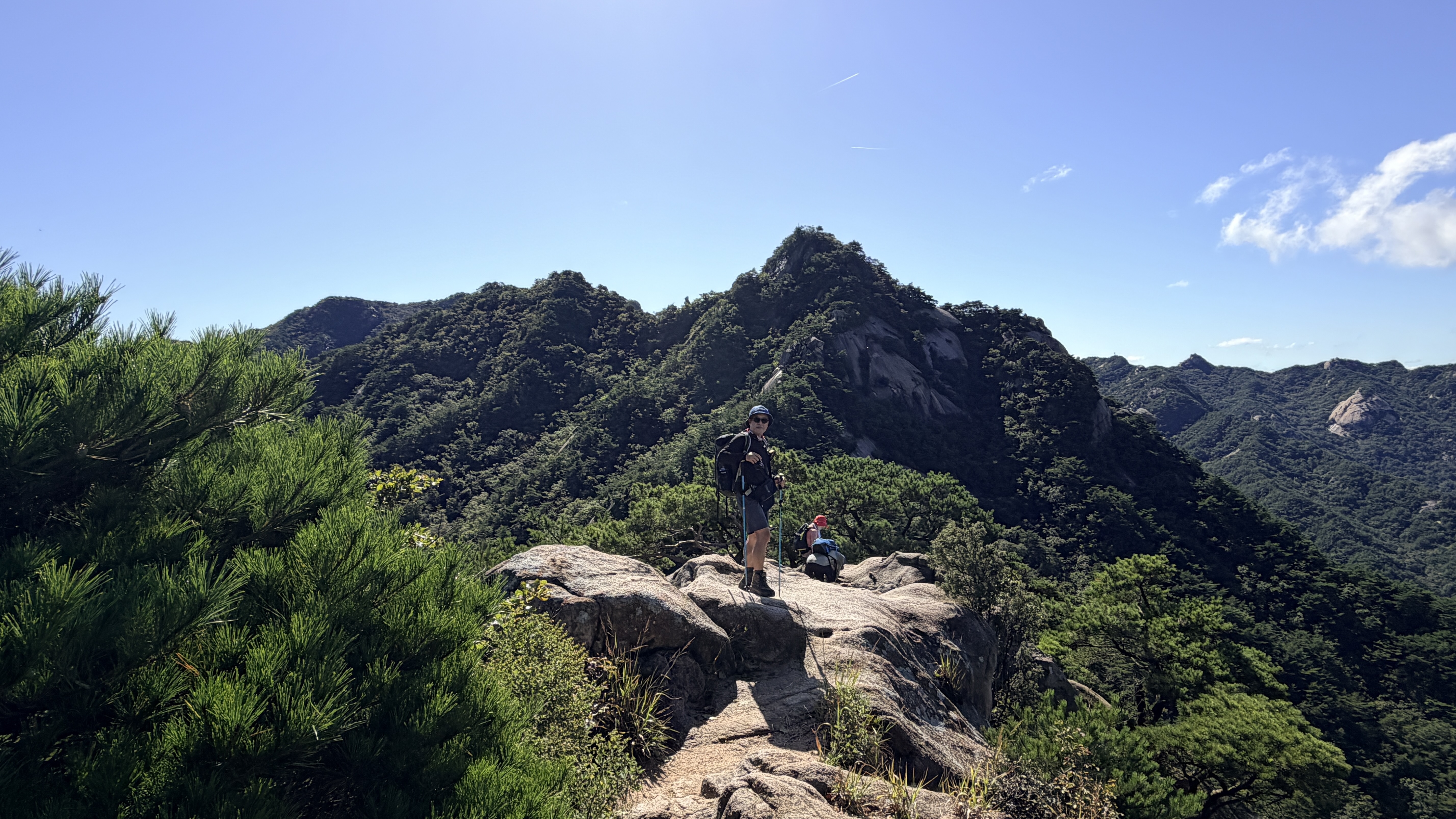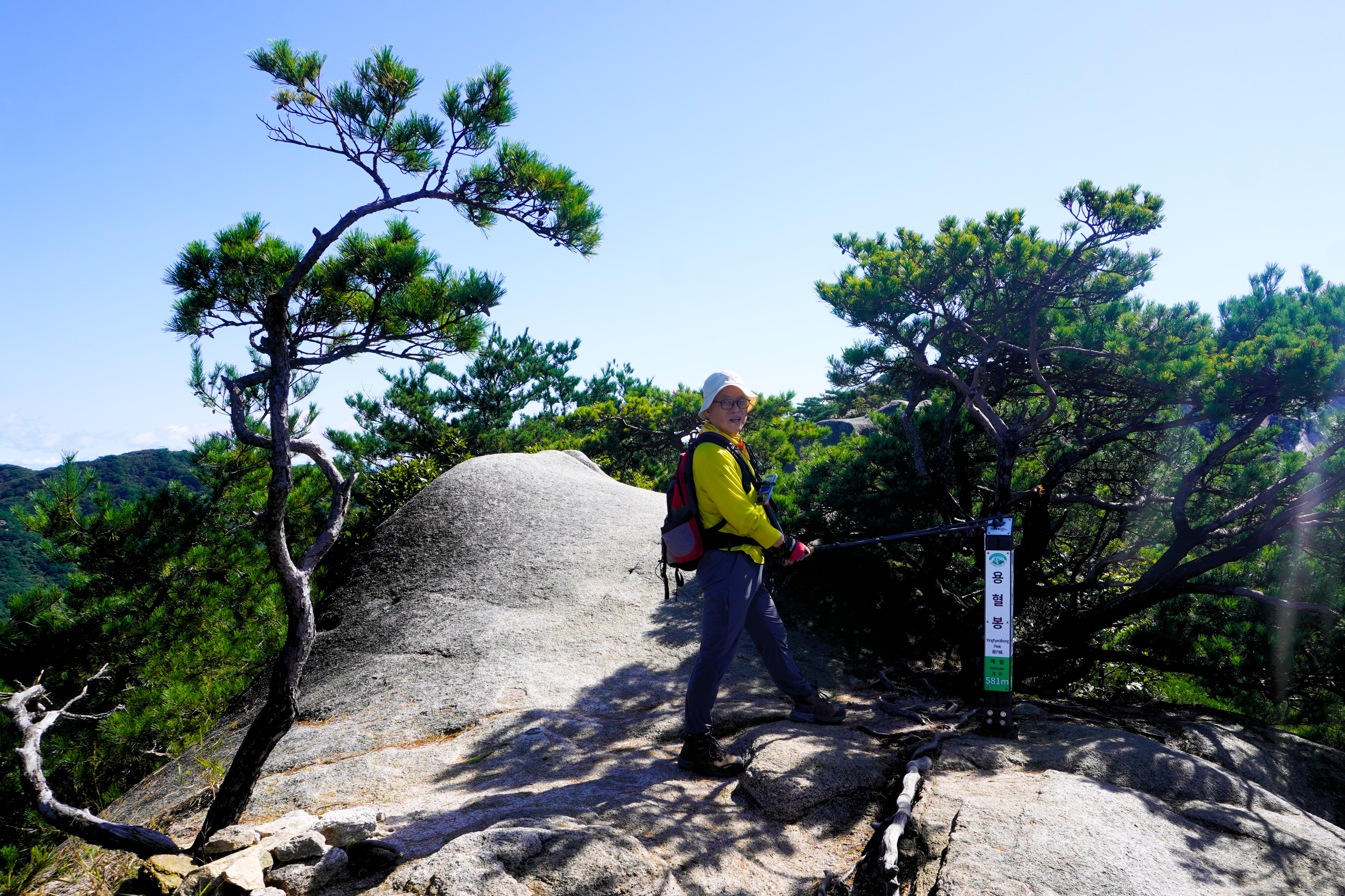 용혈봉 정상석은 차라리 할미바위 근처로 옮기는 게 어딸까. 먼저 도착한 친구 화와 함께 할미바위를 무대삼아 여러 장의 인증샷을 남겨본다. 의상봉과 용혈봉을 오르느라 소진해 버린 힘을 재충전이라도 하듯이.
